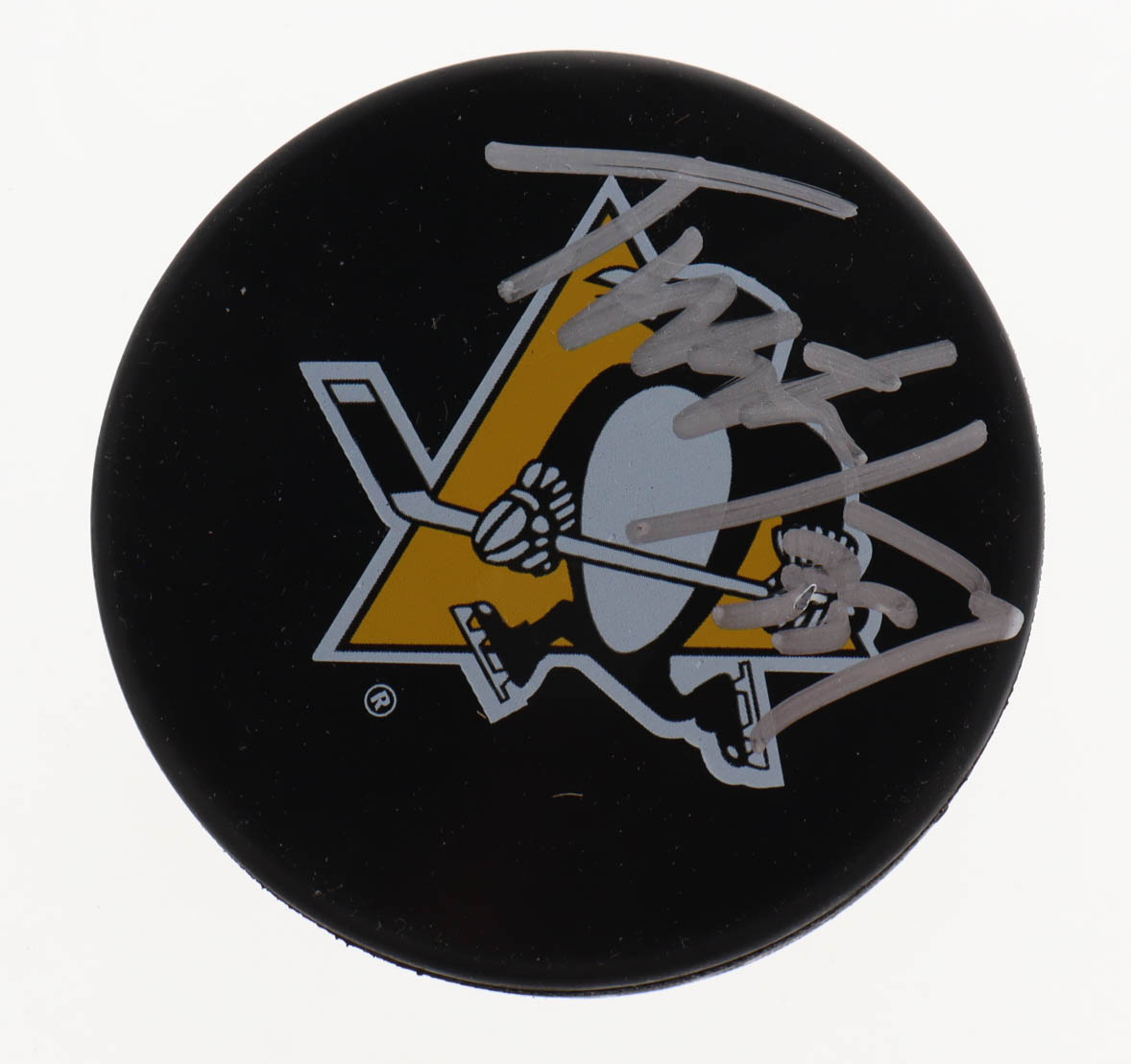 Pittsburgh Penguins logo hockey puck. Hand-signed by Tristan Jarry.