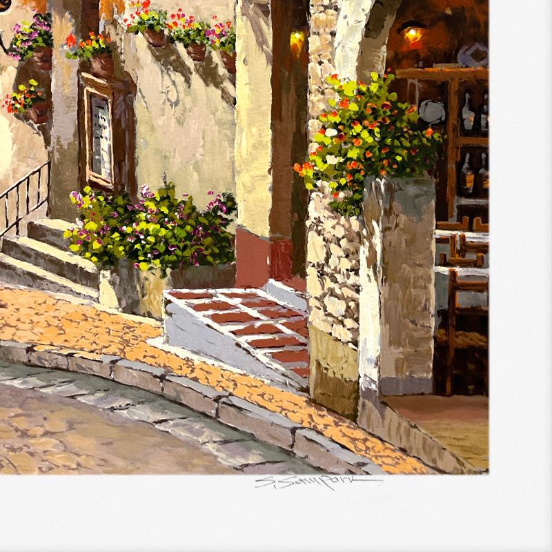 "Cafe d'Le Stable" is a limited edition printer's proof serigraph on paper by Sam Park, numbered and hand signed by the artist. Includes Letter of Authenticity. Measures approx. 26.5" x 34" (border), 22" x 30" (image).