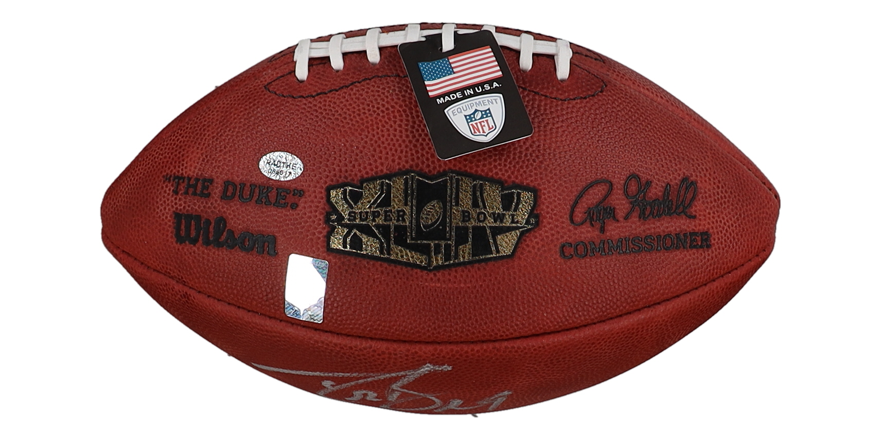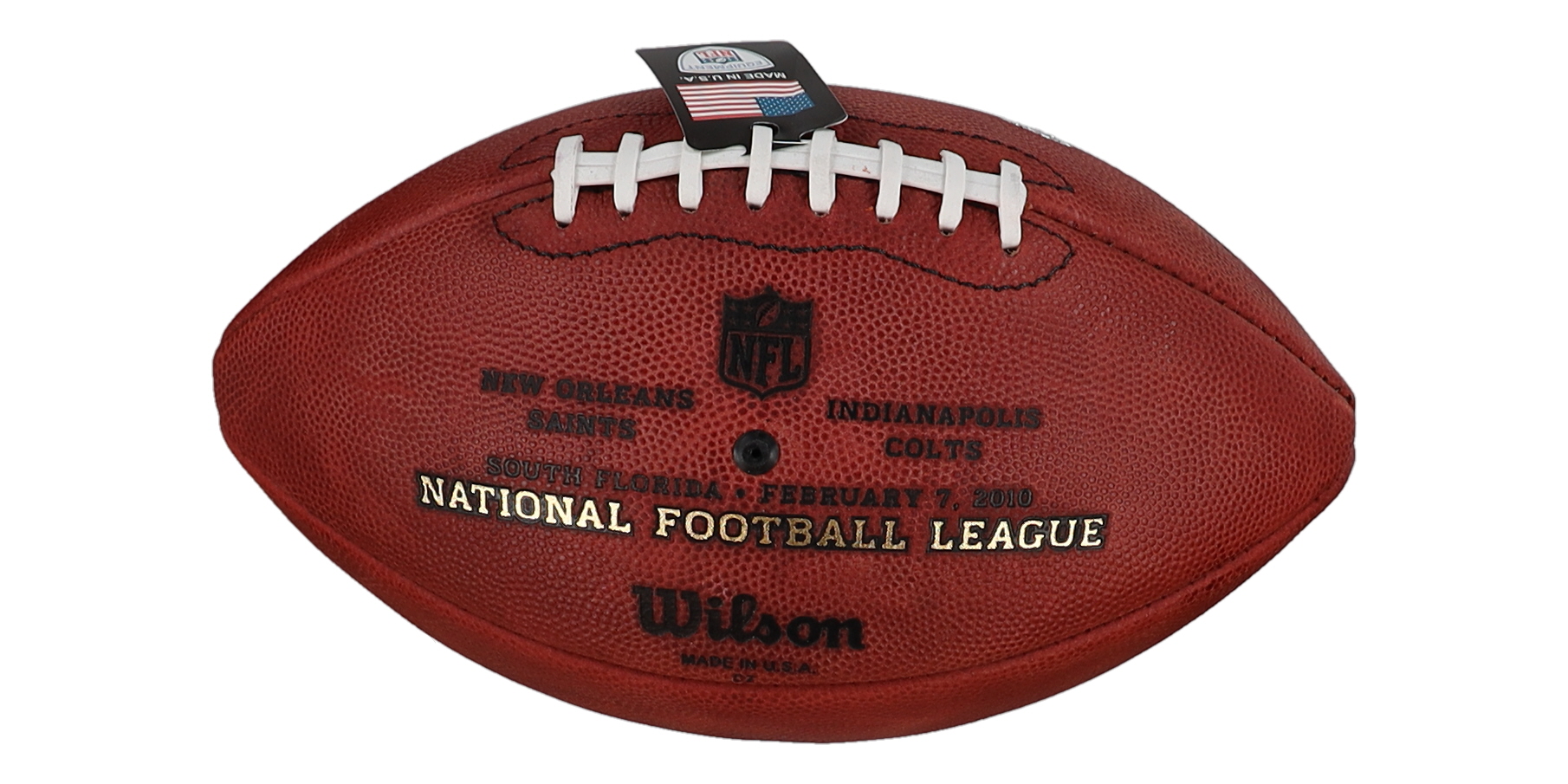 Wilson Official "The Duke" Super Bowl XLIV logo football has been hand-signed and inscribed by Drew Brees (New Orleans Saints).