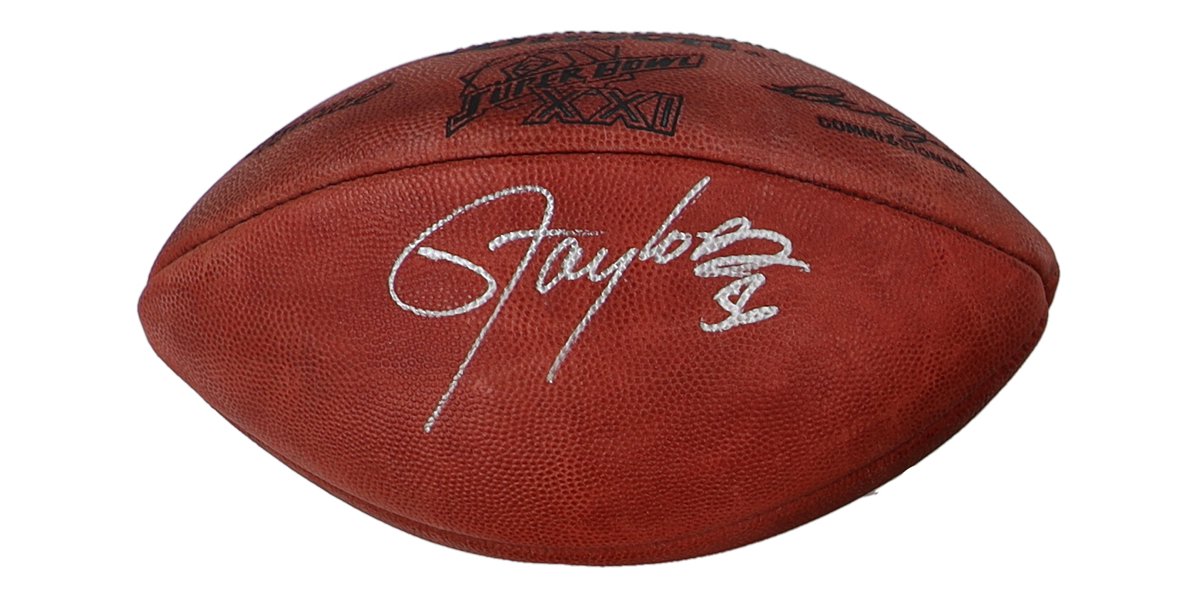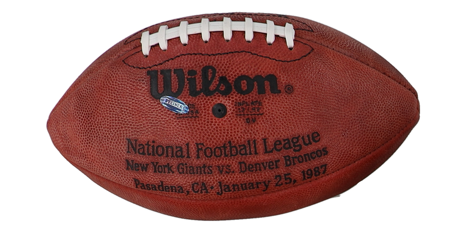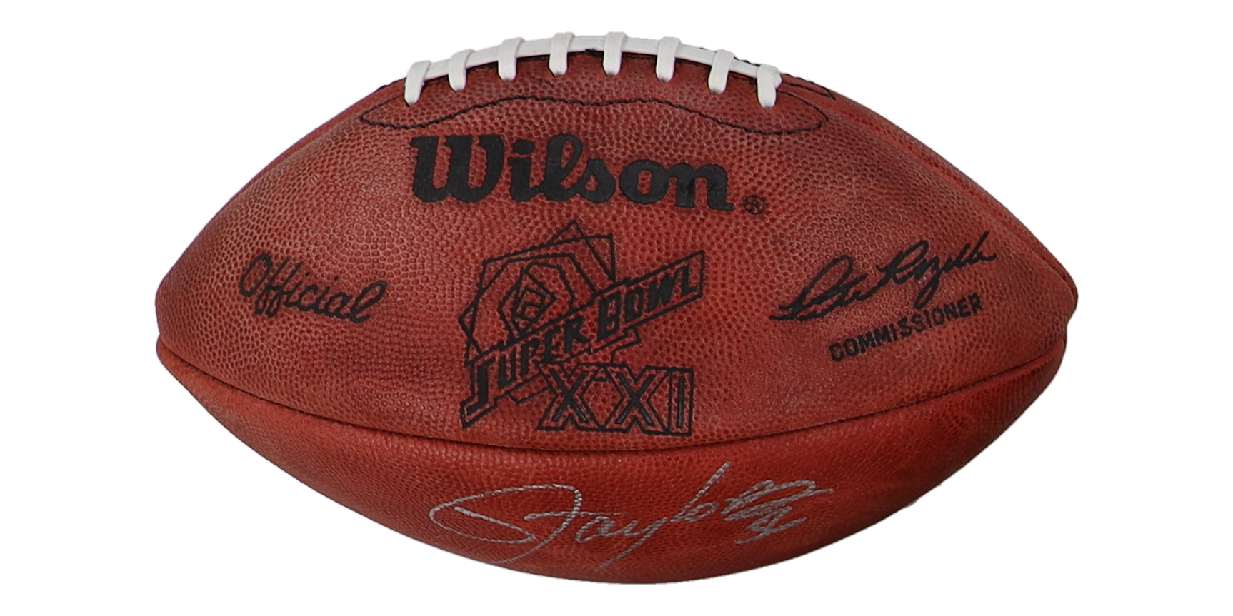 Wilson Official Super Bowl XXI logo football has been hand-signed by Lawrence Taylor (New York Giants, HOF).