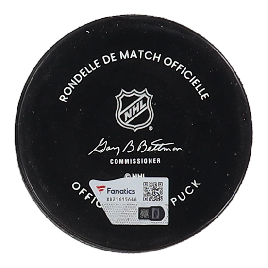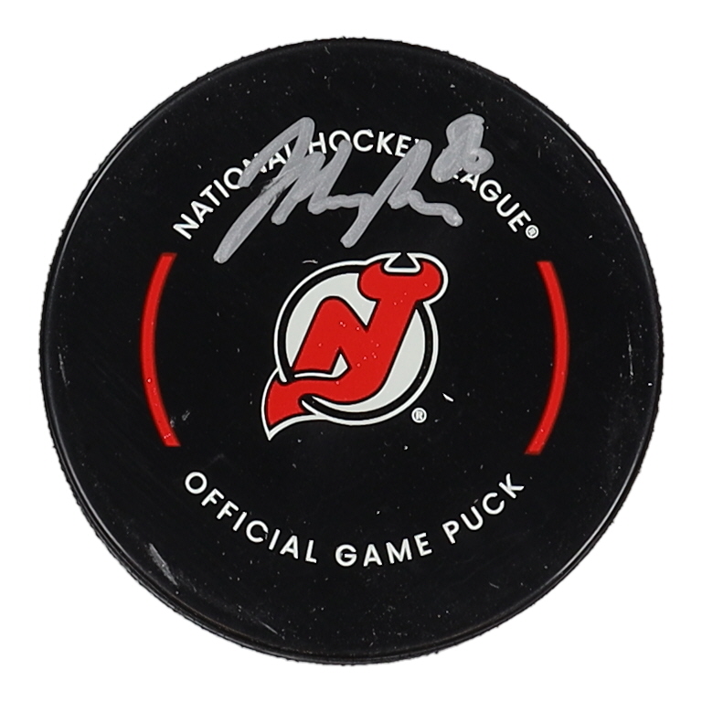 New Jersey Devils logo hockey puck has been hand-signed by Jack Hughes.
