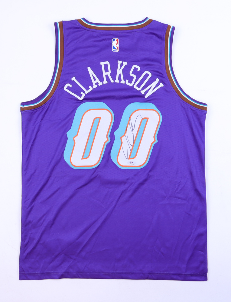 Nike jersey with everything pressed on, size 50. Hand-signed by Jordan Clarkson.