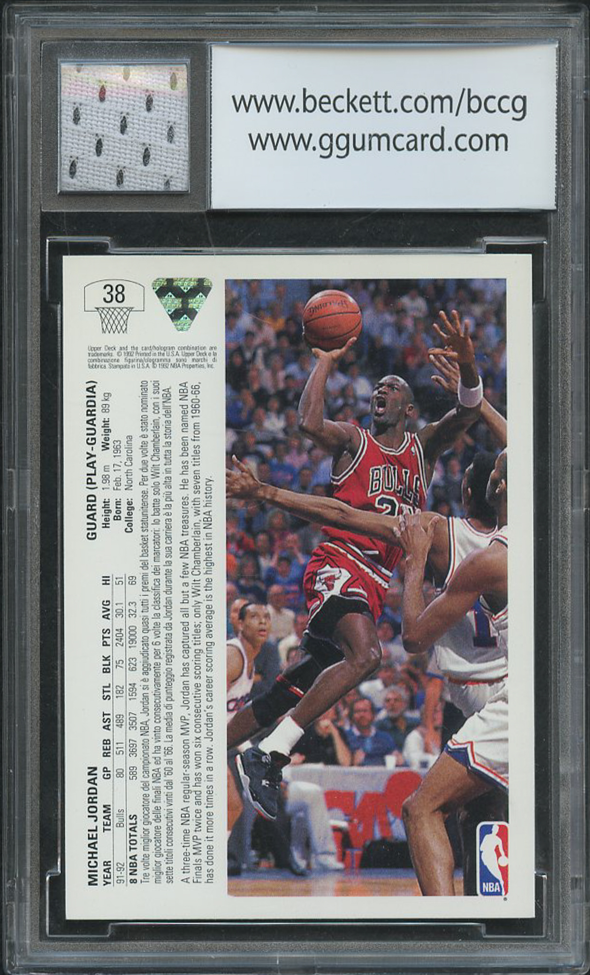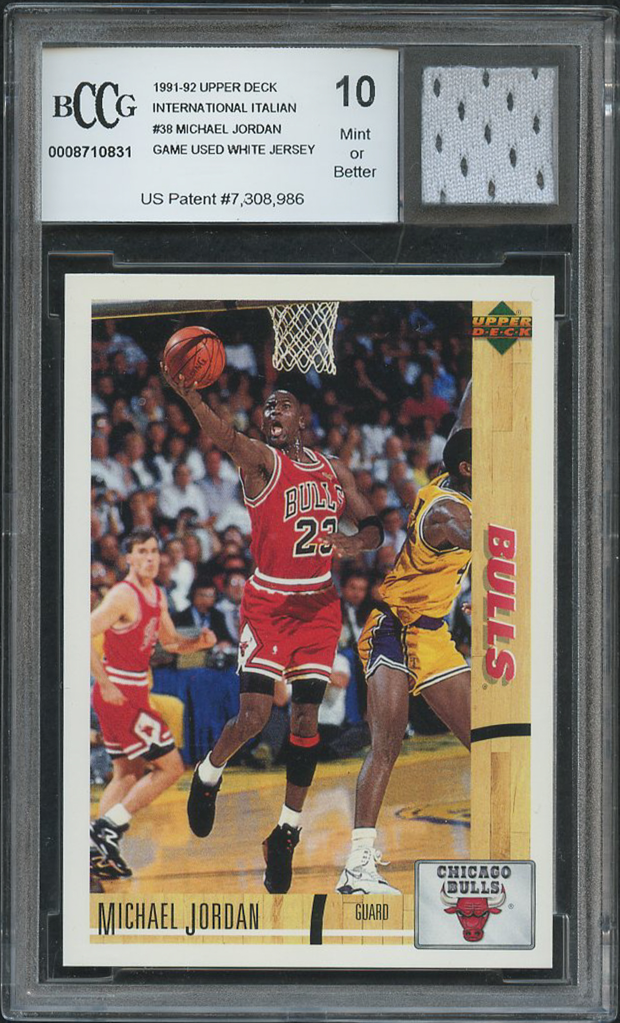 1991-92 Upper Deck International Italian #38 Michael Jordan with Piece of Game-Used Bulls Jersey (BCCG 10)