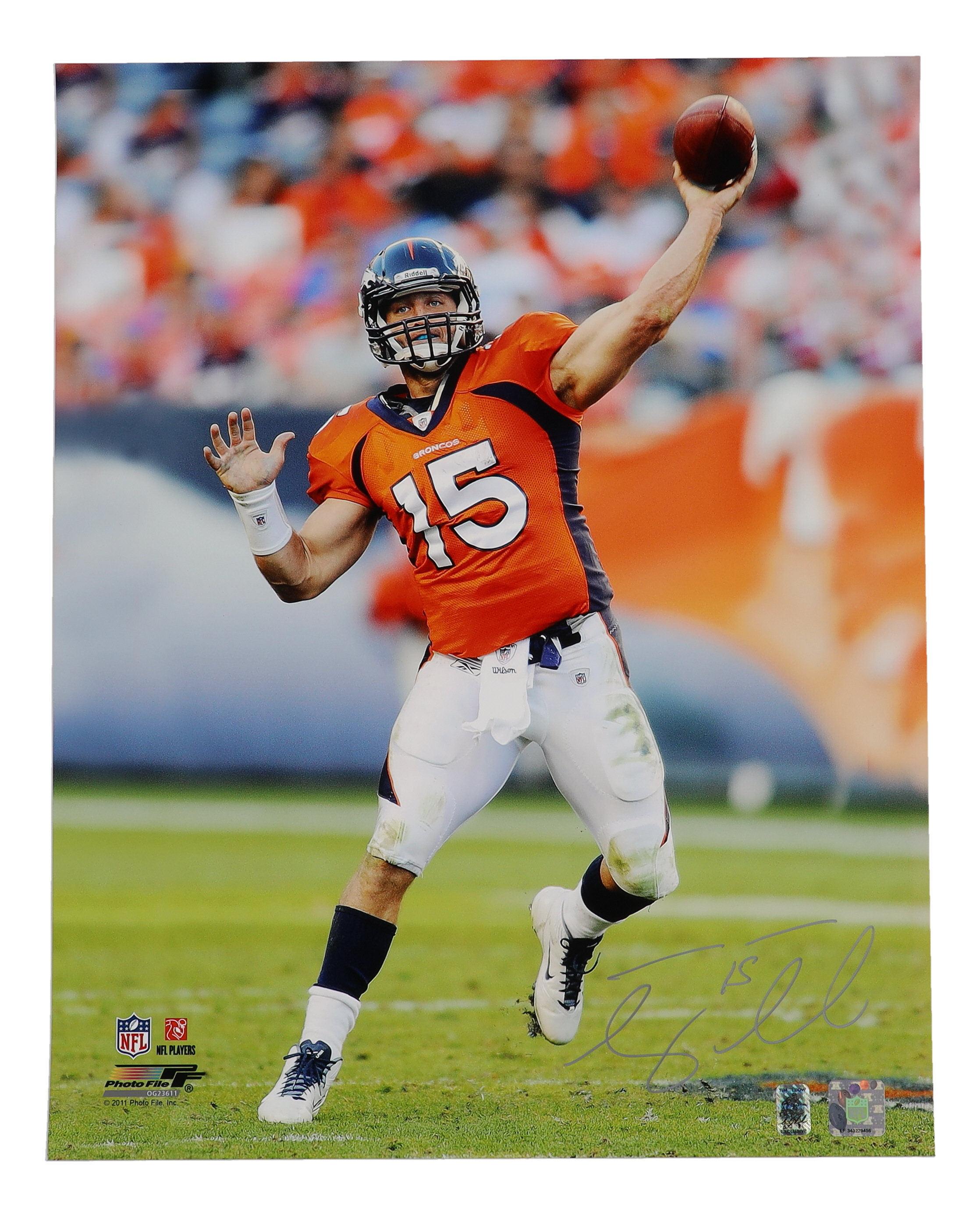 Photo measures 16" x 20" in size and has been hand-signed by Tim Tebow (Denver Broncos).