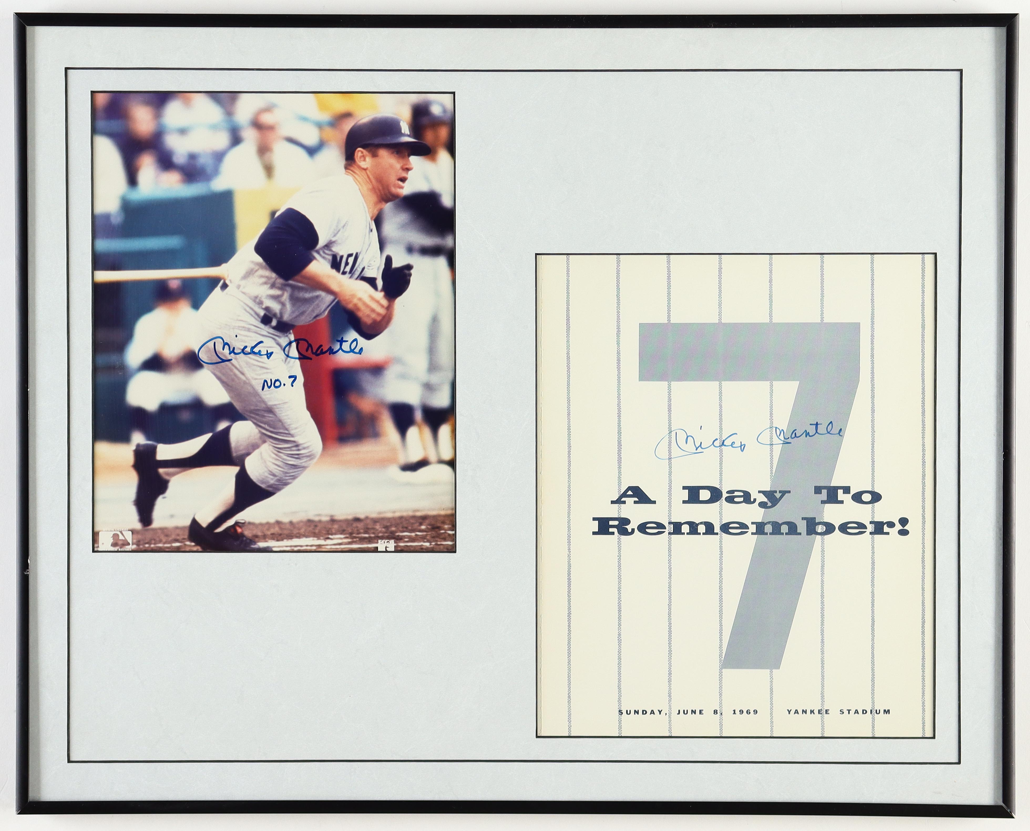 Custom frame measures 16" x 20" in size and features a photo and a 1969 "A Day to Remember!" Yankee Stadium Program that has been hand-signed by Mickey Mantle (D. 1995, New York Yankees, HOF).
