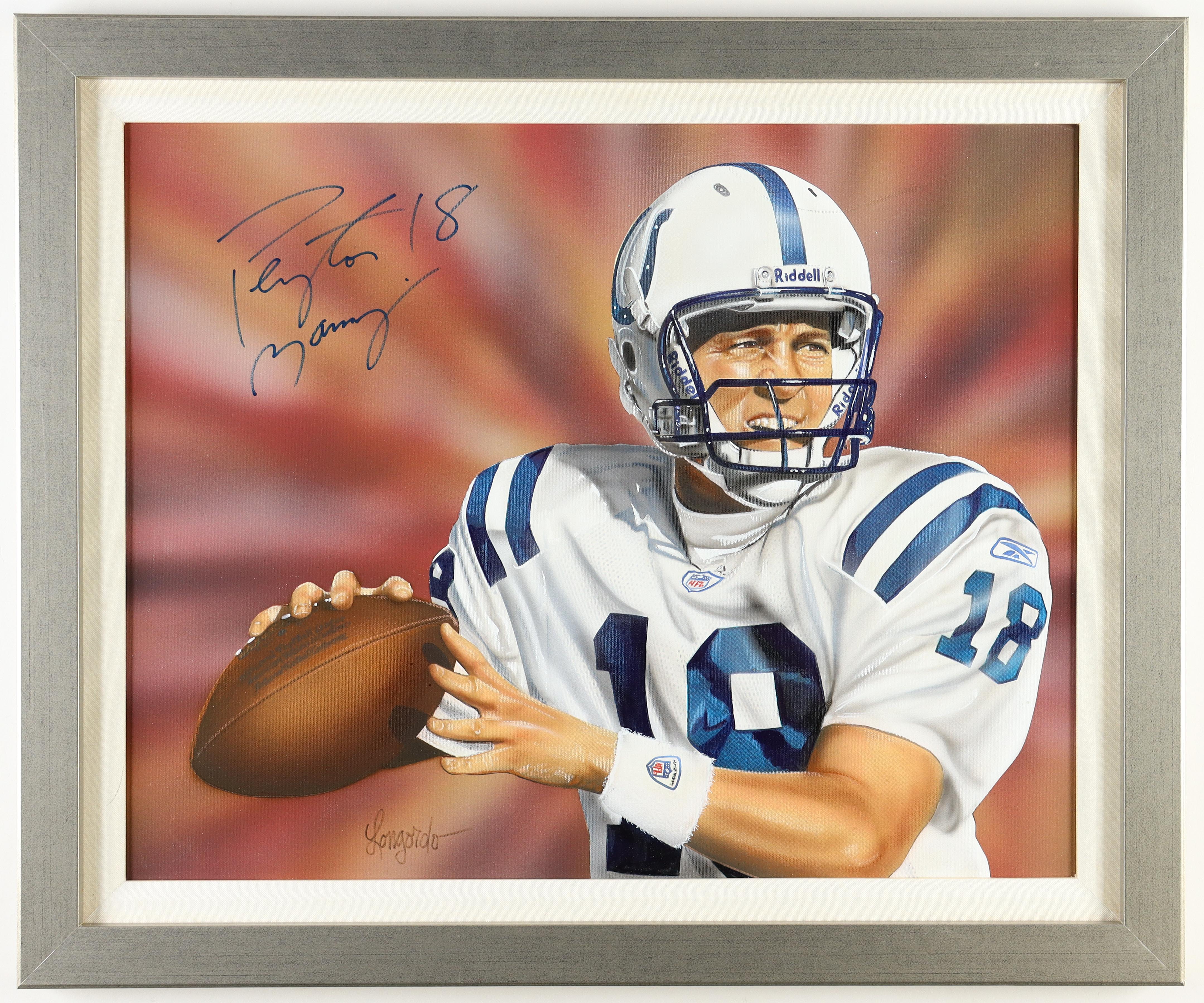 Custom framed display measures approximately 25" x 30" in size and has been hand-signed by Peyton Manning (Indianapolis Colts, HOF). The art print is made by Gary Longordo.