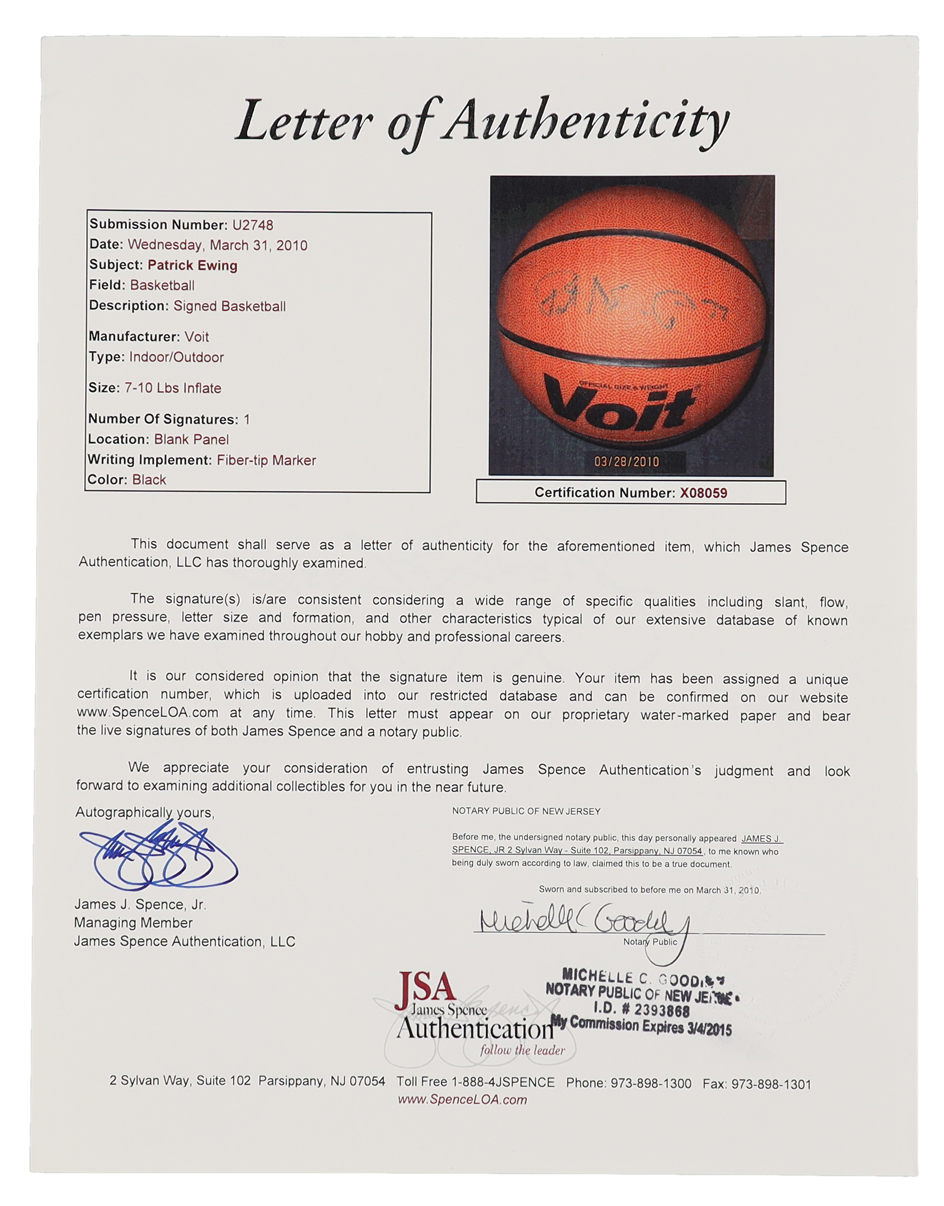 Patrick Ewing Signed Voit Player Model Basketball (JSA)