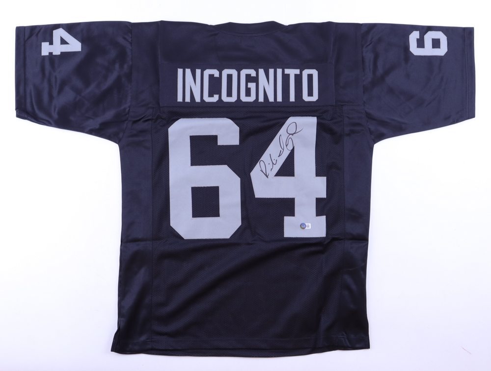 Custom football jersey. Everything sewn on, size XL. Hand-signed by Richie Incognito.