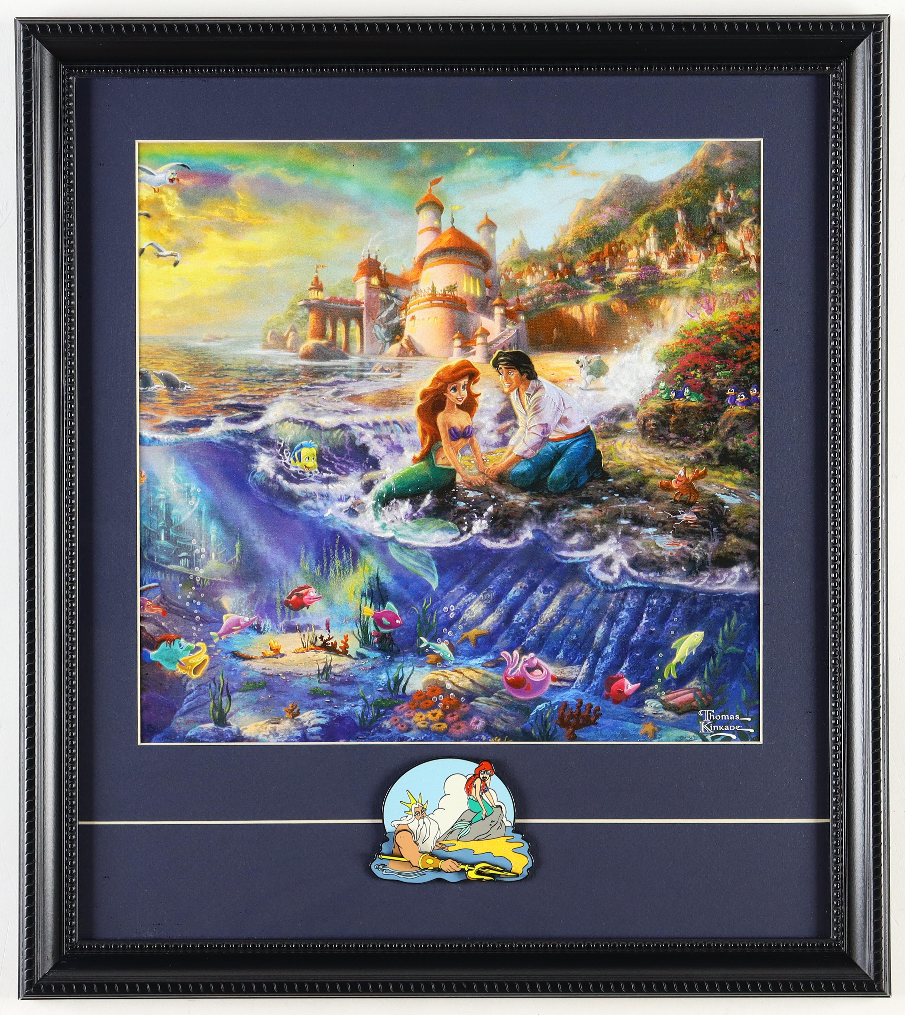 Custom frame measures approximately 16" x 18" in size. Features a Thomas Kinkade "The Little Mermaid" print. The display also includes a Disney Ariel & King Triton Dual Action Pin. Please note, the item is unsigned.