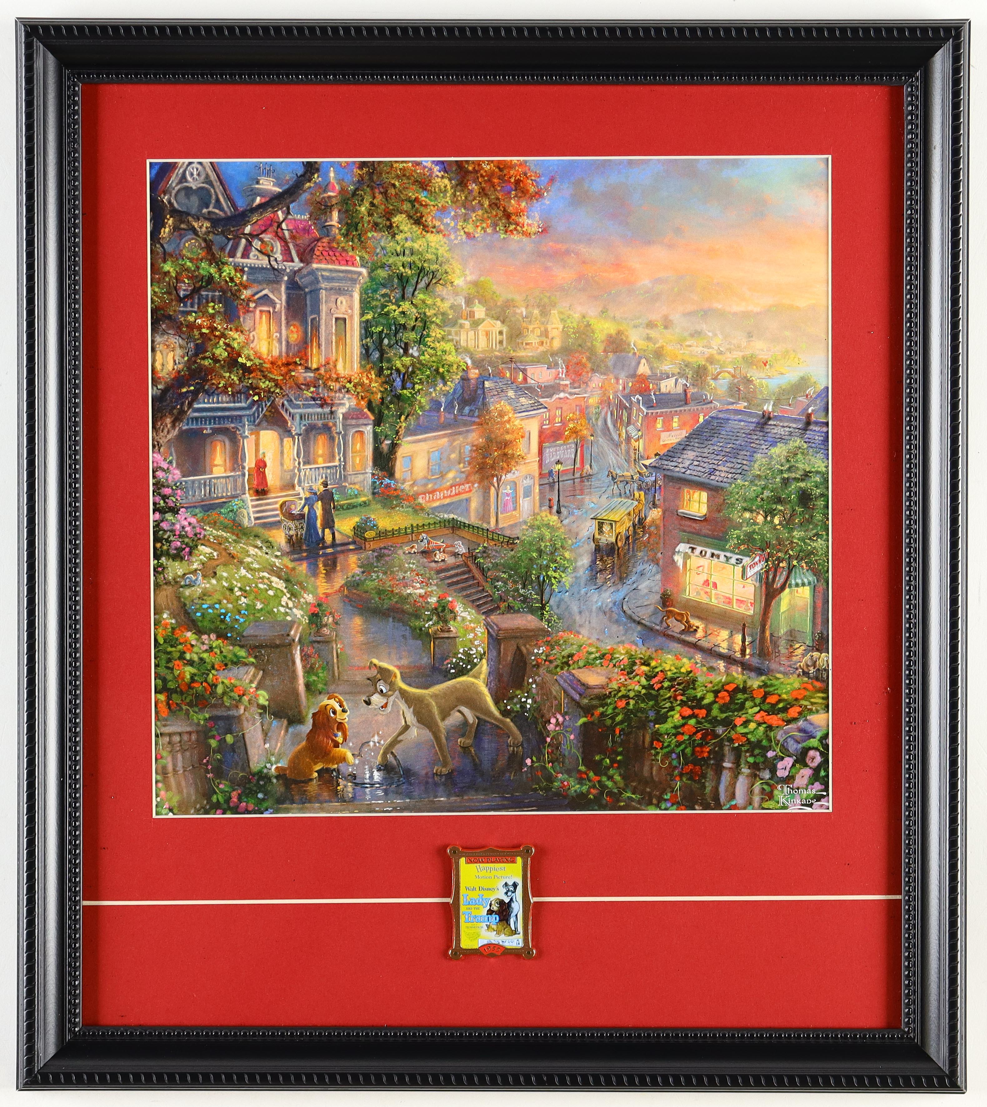 Thomas Kinkade "Lady & The Tramp" Custom Framed Print Display With Retired Lady & The Tramp Movie Poster Pin