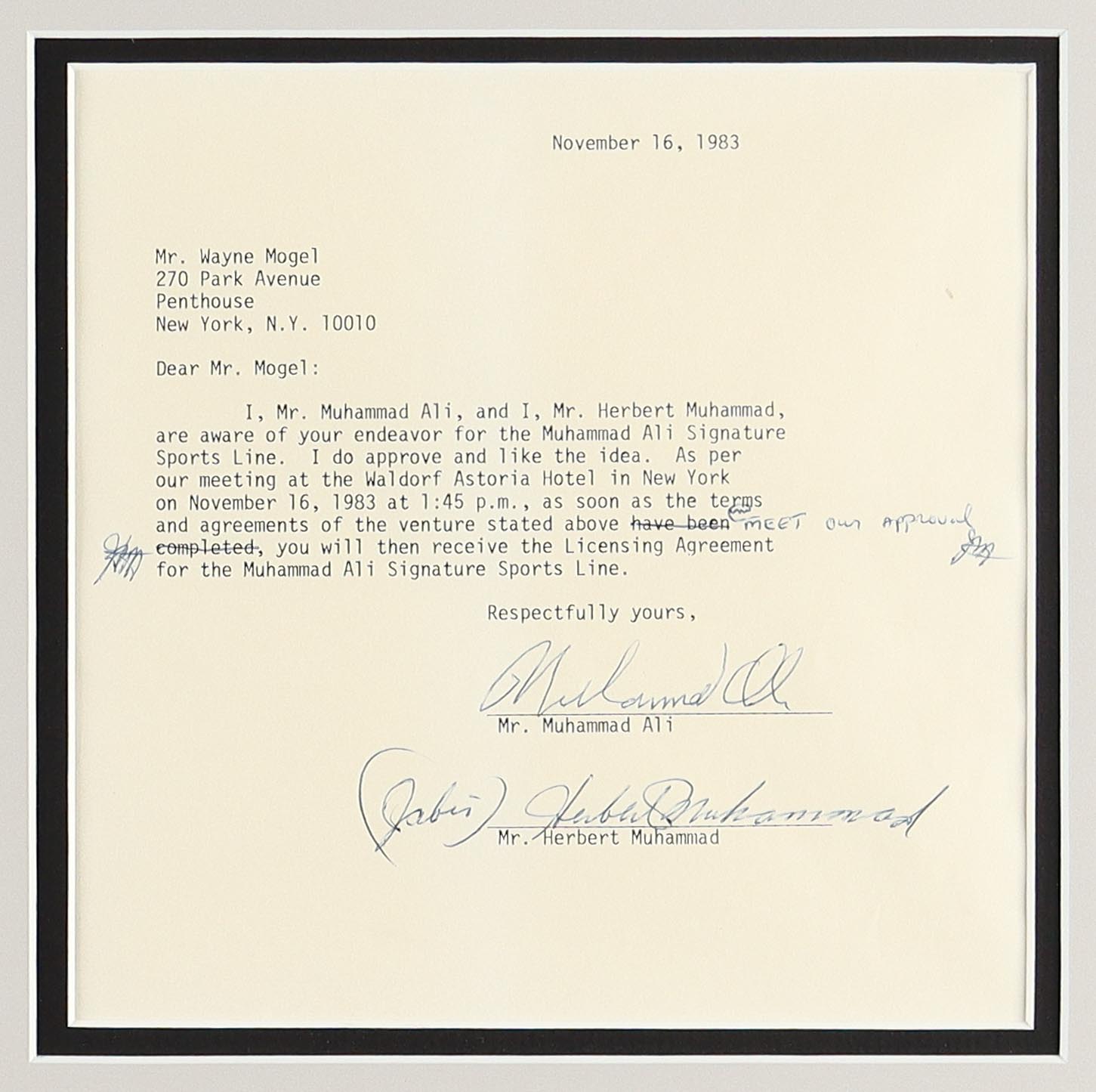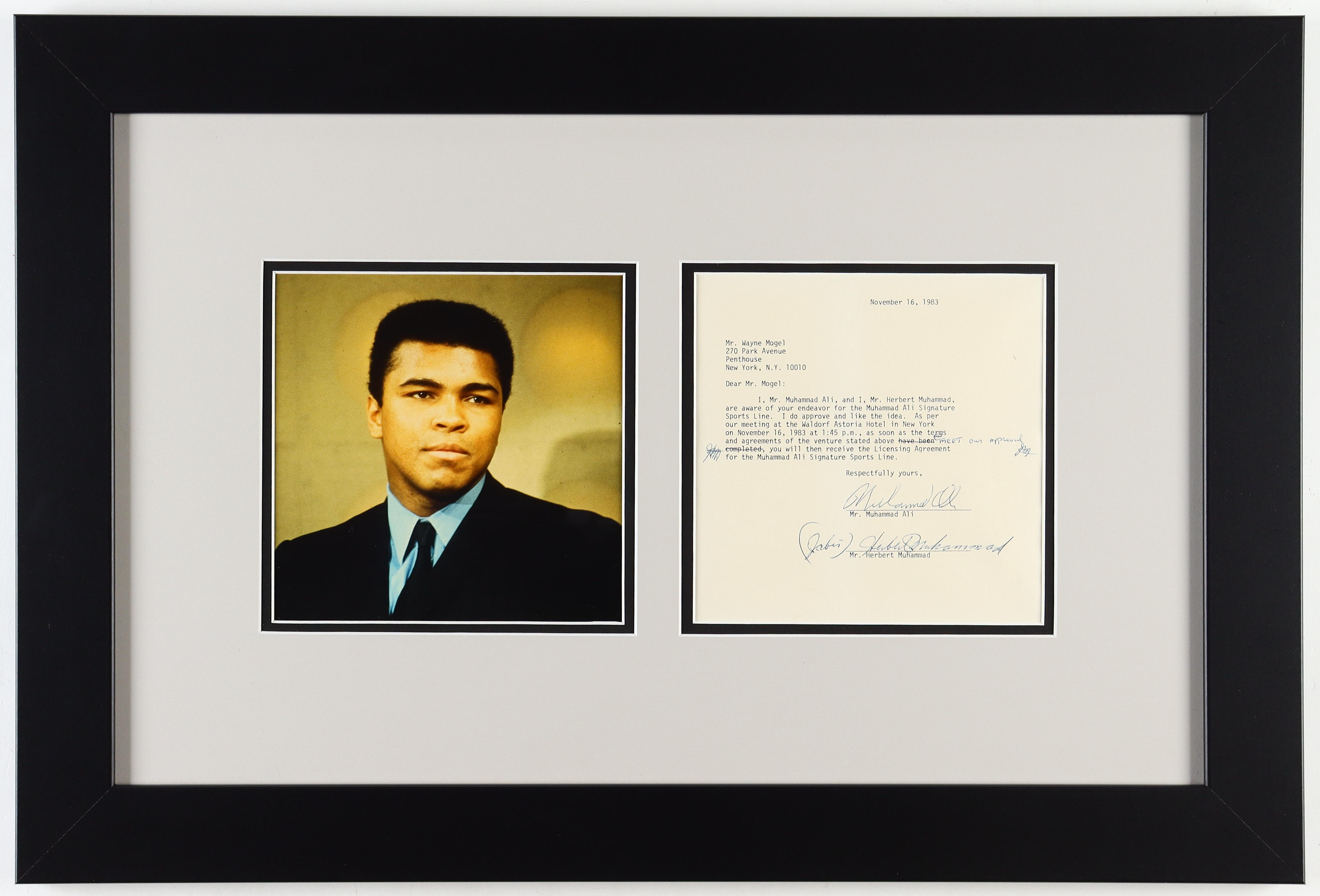 Custom frame measures 18" x 26.5" in size and features a agreement letter dated November 16th, 1983 that has been hand-signed by Muhammad Ali!