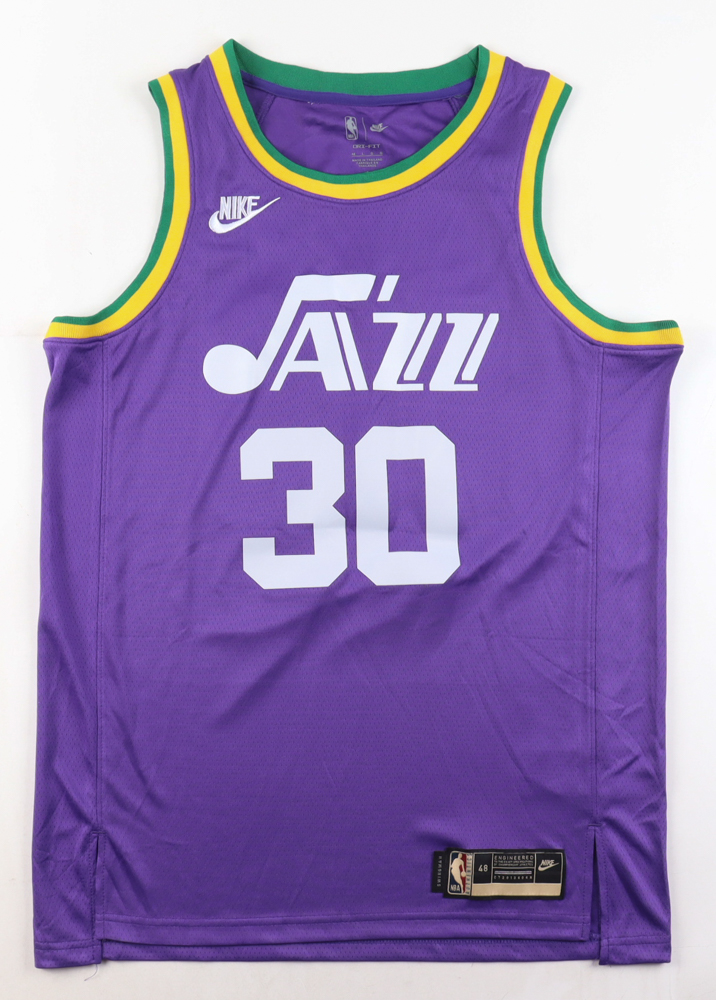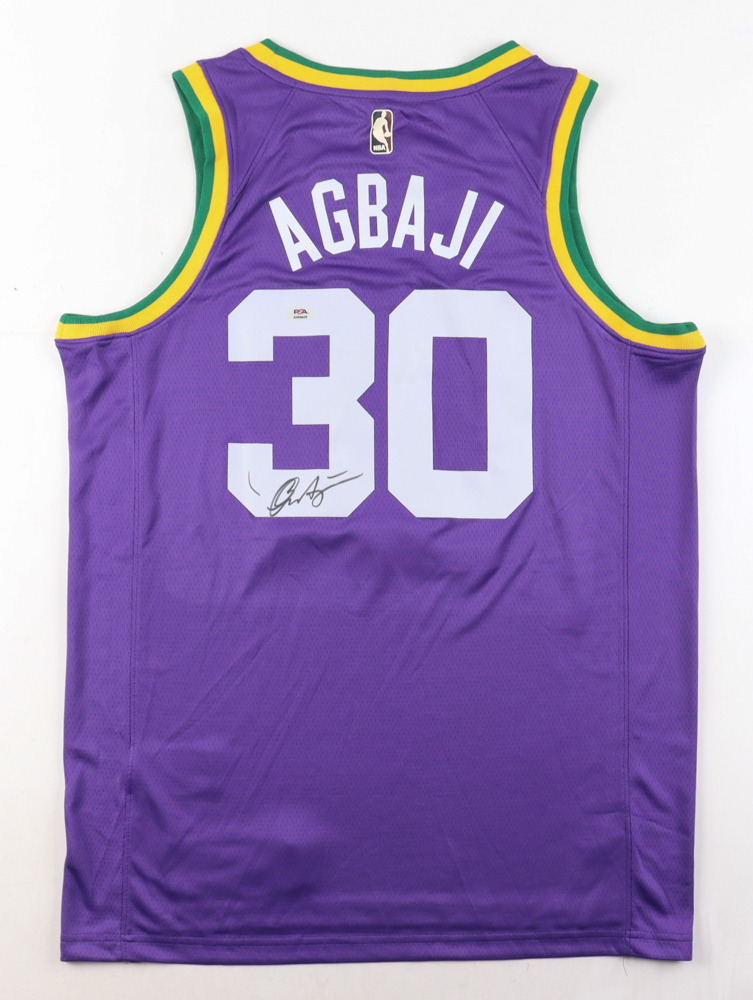 Nike jersey. Everything is pressed on, size 48. Hand-signed by Ochai Agbaji. Please note, there are stray ink marks near the signature.
