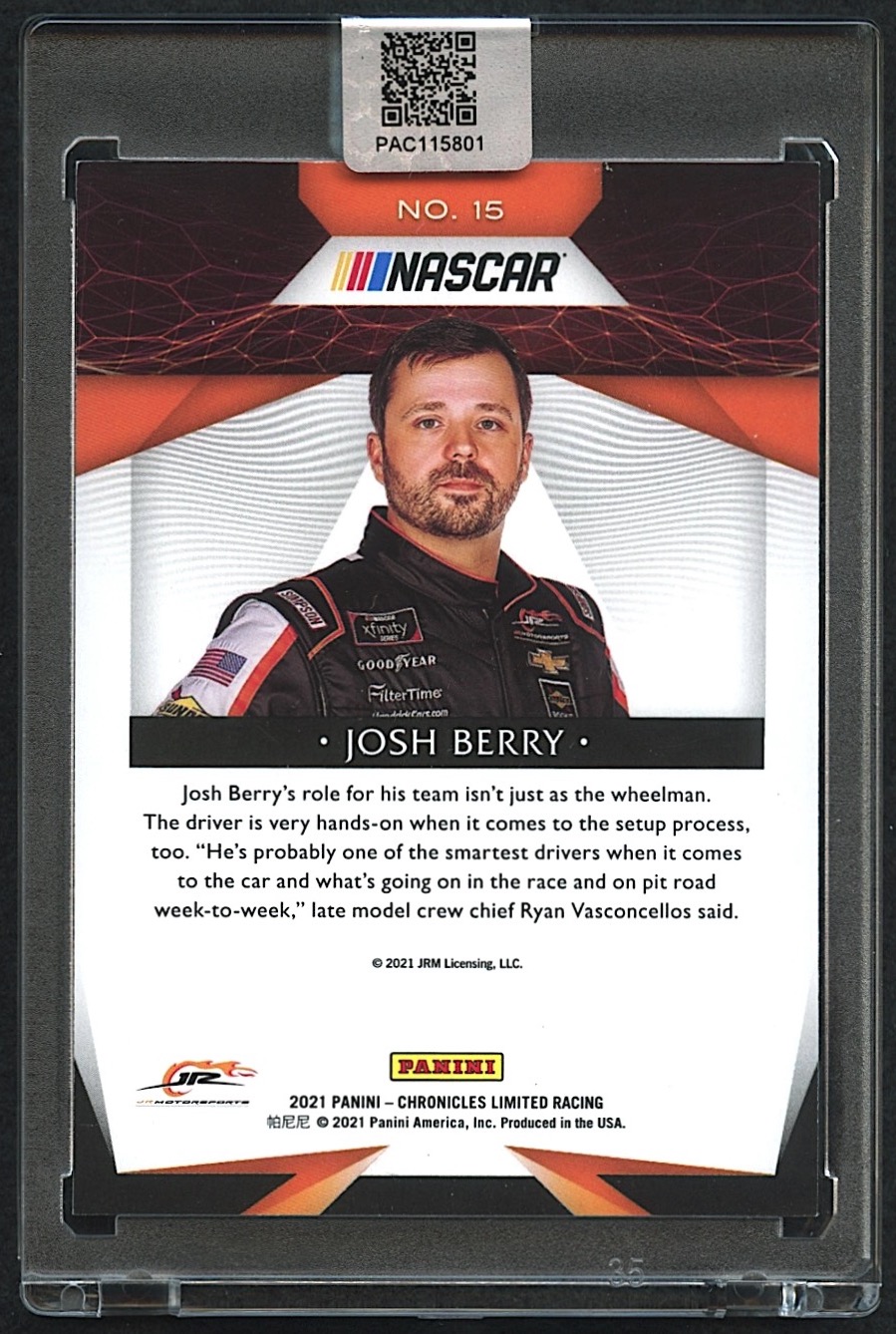 Josh Berry Signed 2021 Panini Chronicles Limited #15 Blue #008/199 RC (PA Encapsulated)