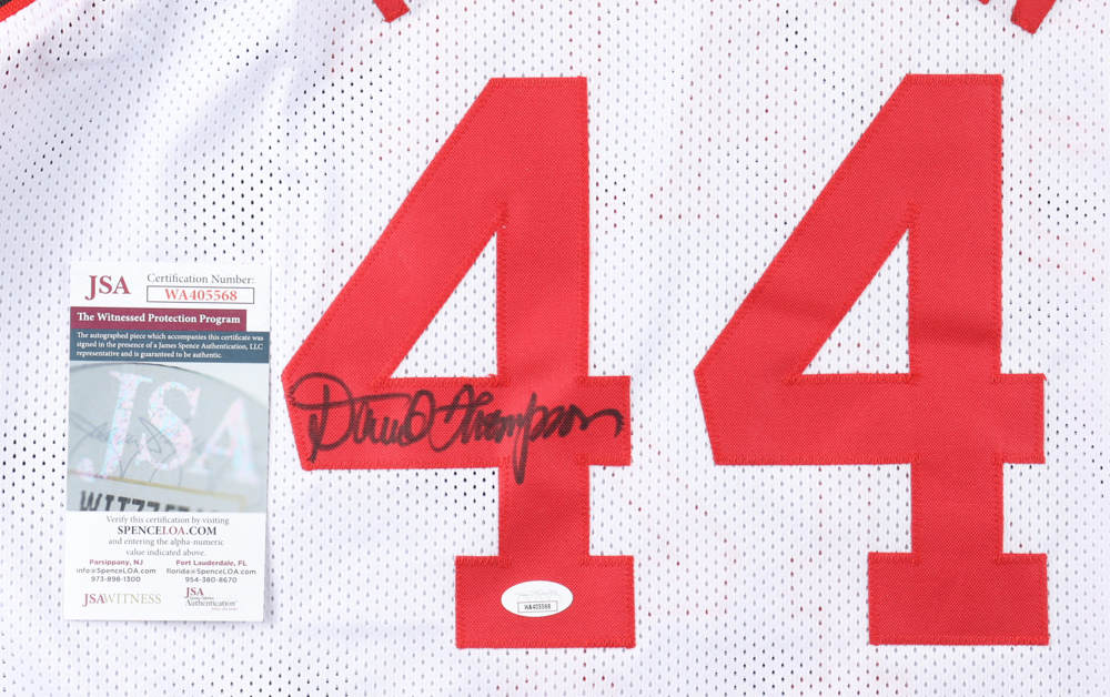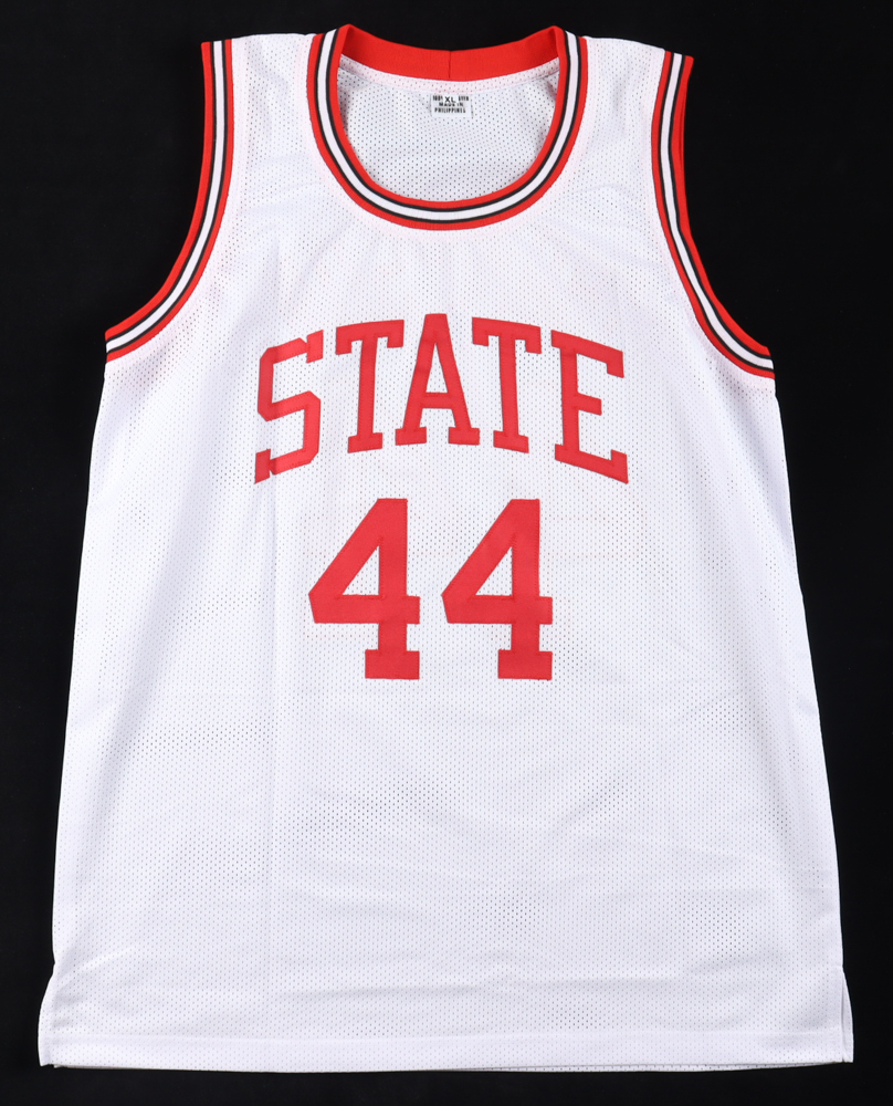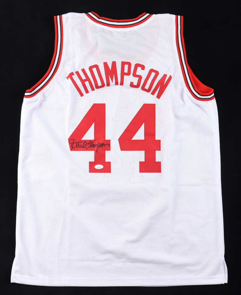 Custom basketball jersey. Everything sewn on, size XL. Hand-signed by David Thompson (HOF).