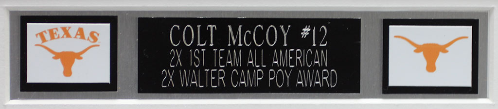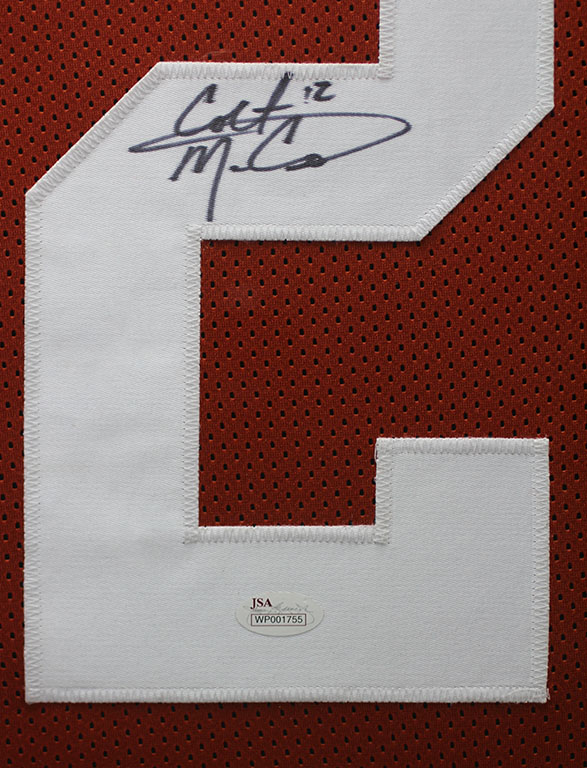 A beautifully framed autographed Colt McCoy Texas Longhorns Jersey. The autograph is certified by JSA and includes a sticker on the Jersey and a matching certificate attached to the back of the frame.