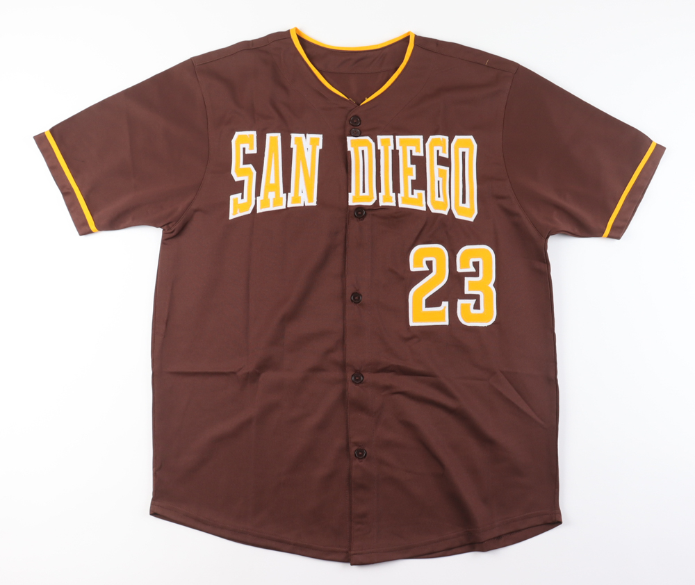 Custom jersey with everything sewn on, size XL. Hand-signed by Fernando Tatis Jr. Please note, the signature has bled.