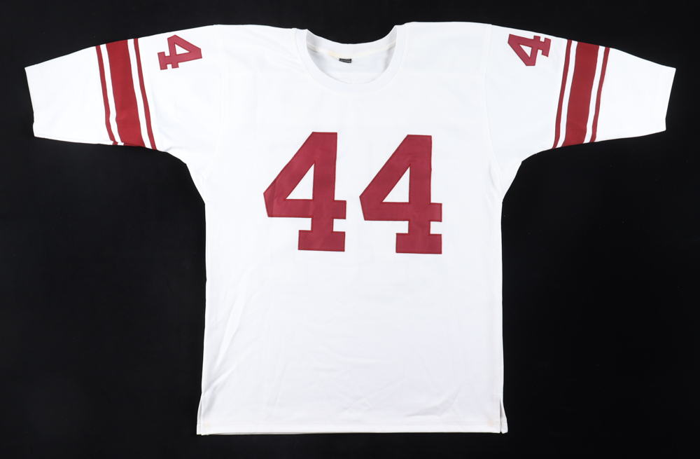 Custom jersey. Everything sewn on, size XL. Hand-signed and inscribed by John David Crow (D. 2015). Please note, there are multiple stains on the front and back of the jersey.