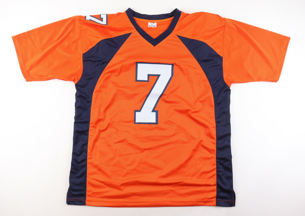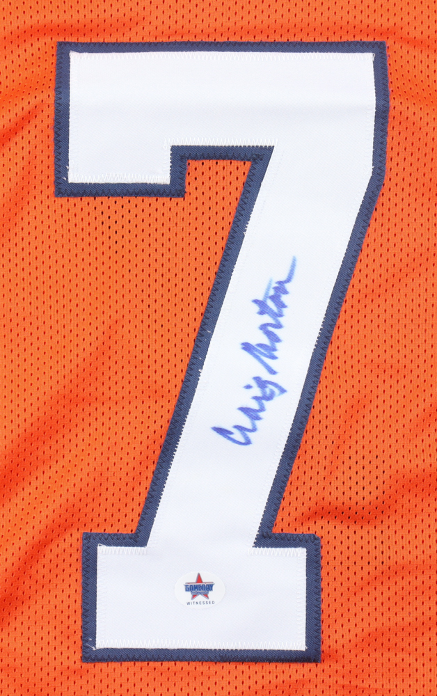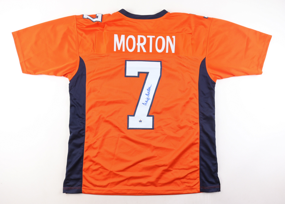 Custom jersey. Everything sewn on, size XL. Hand-signed by Craig Morton. Please note, the signature has bled.