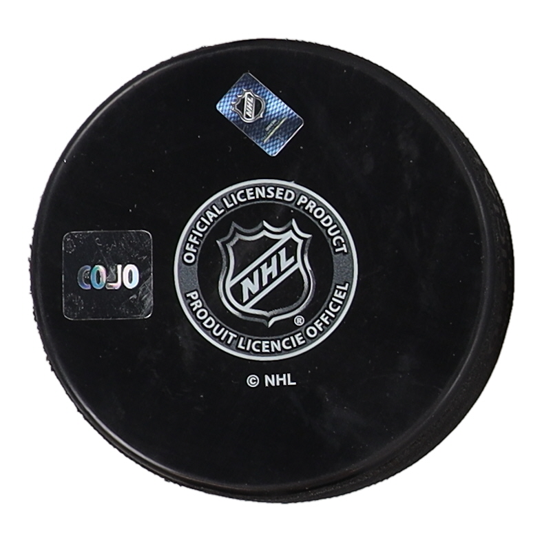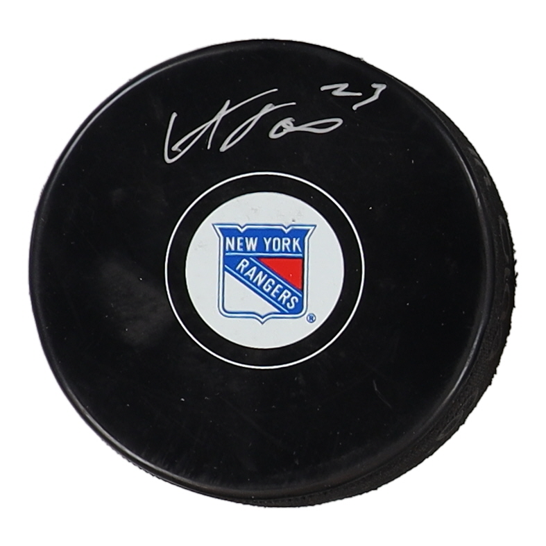 Official New York Rangers logo hockey puck is hand-signed by Adam Fox.