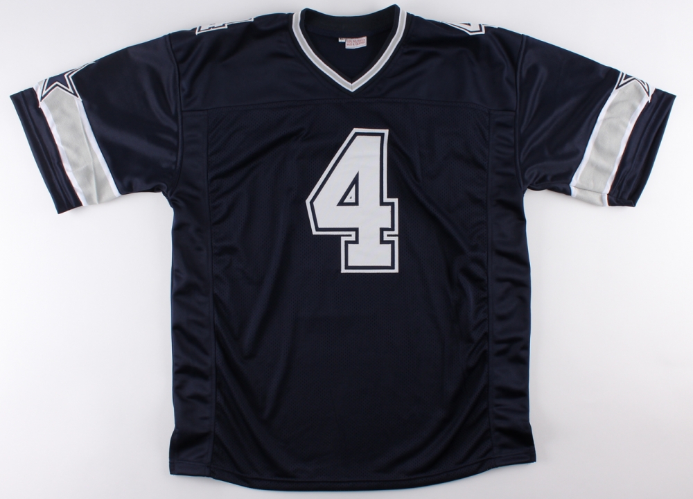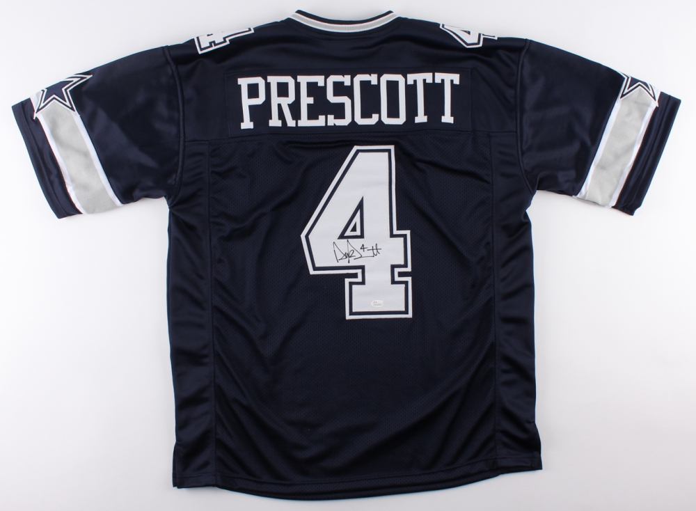 Custom on-field style jersey. Everything is sewn on, size XL. Hand-signed in black felt-tip pen by Dak Prescott (Cowboys).