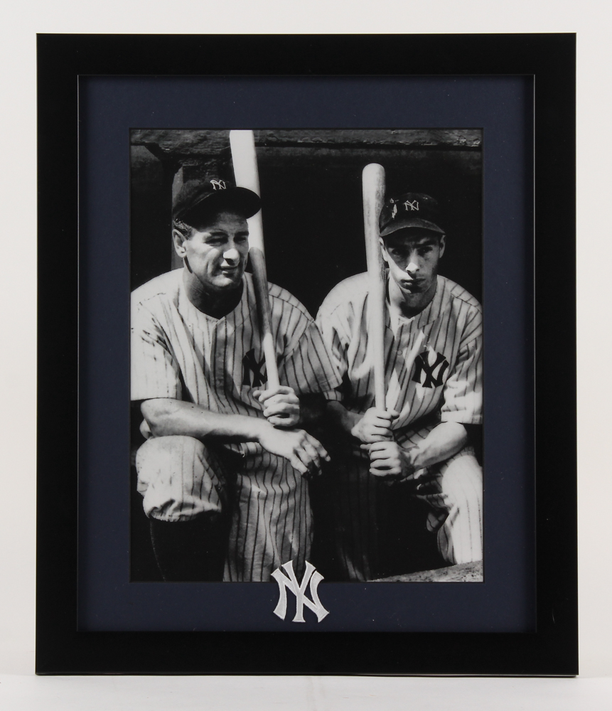 Custom framed photo display measures 16" x 19" in size. Features a photo of Lou Gehrig and Joe DiMaggio. Display also includes a New York Yankees patch