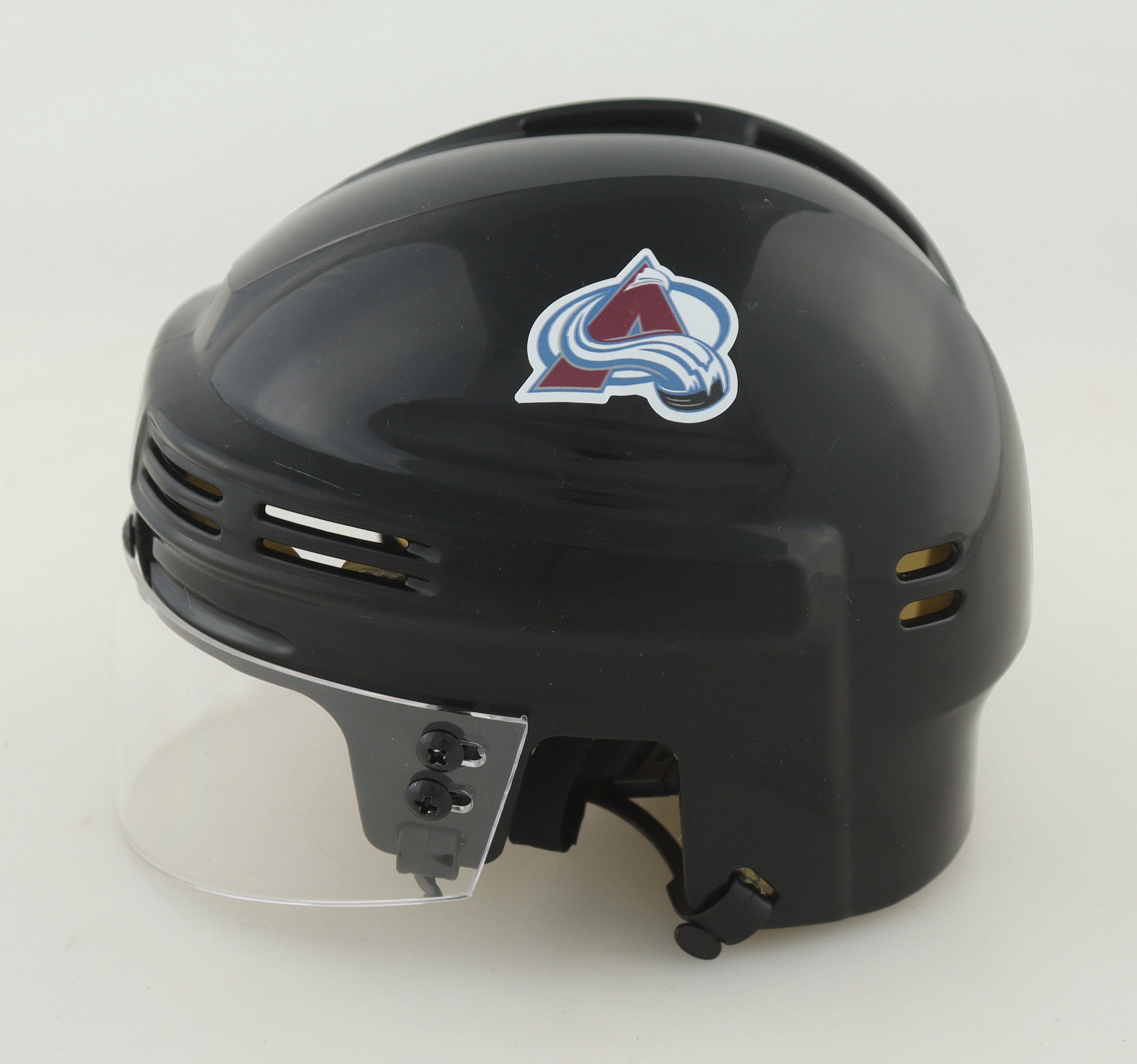 Colorado Avalanche mini helmet has been hand-signed and inscribed by Ray Bourque (HOF).