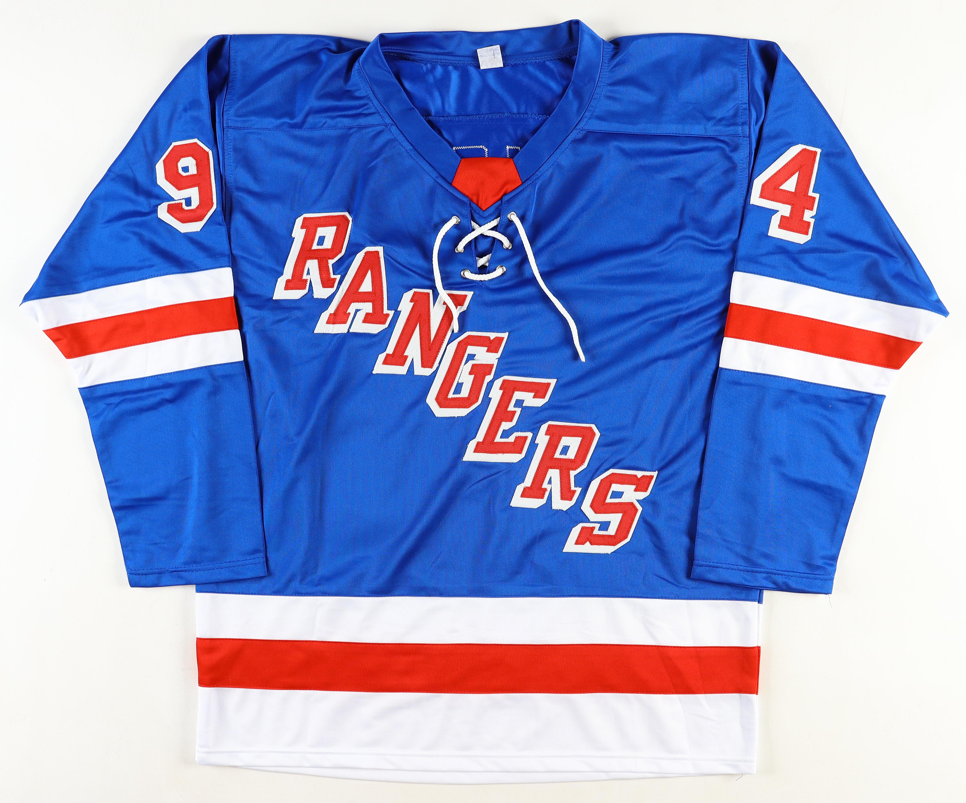 Custom jersey. Everything is sewn on, size XL. Hand-signed by Alexei Kovalev, Steve Larmer, Jay Wells, Mike Hartman, Mike Richter, Eddie Olczyk, Glenn Anderson, Adam Graves, Brian Noonan, Jeff Beukeboom and Joe Kocur.