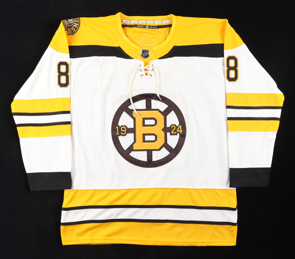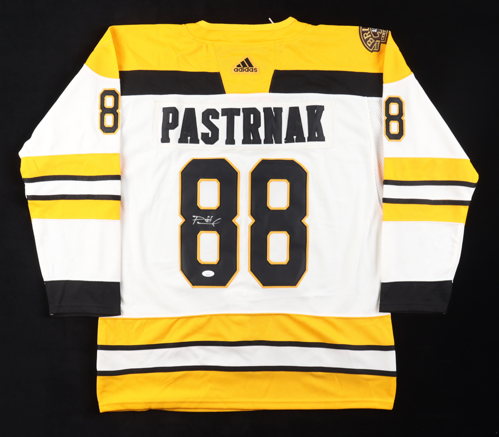 Adidas jersey with everything sewn on, size 54. Has been hand-signed by David Pastrnak.