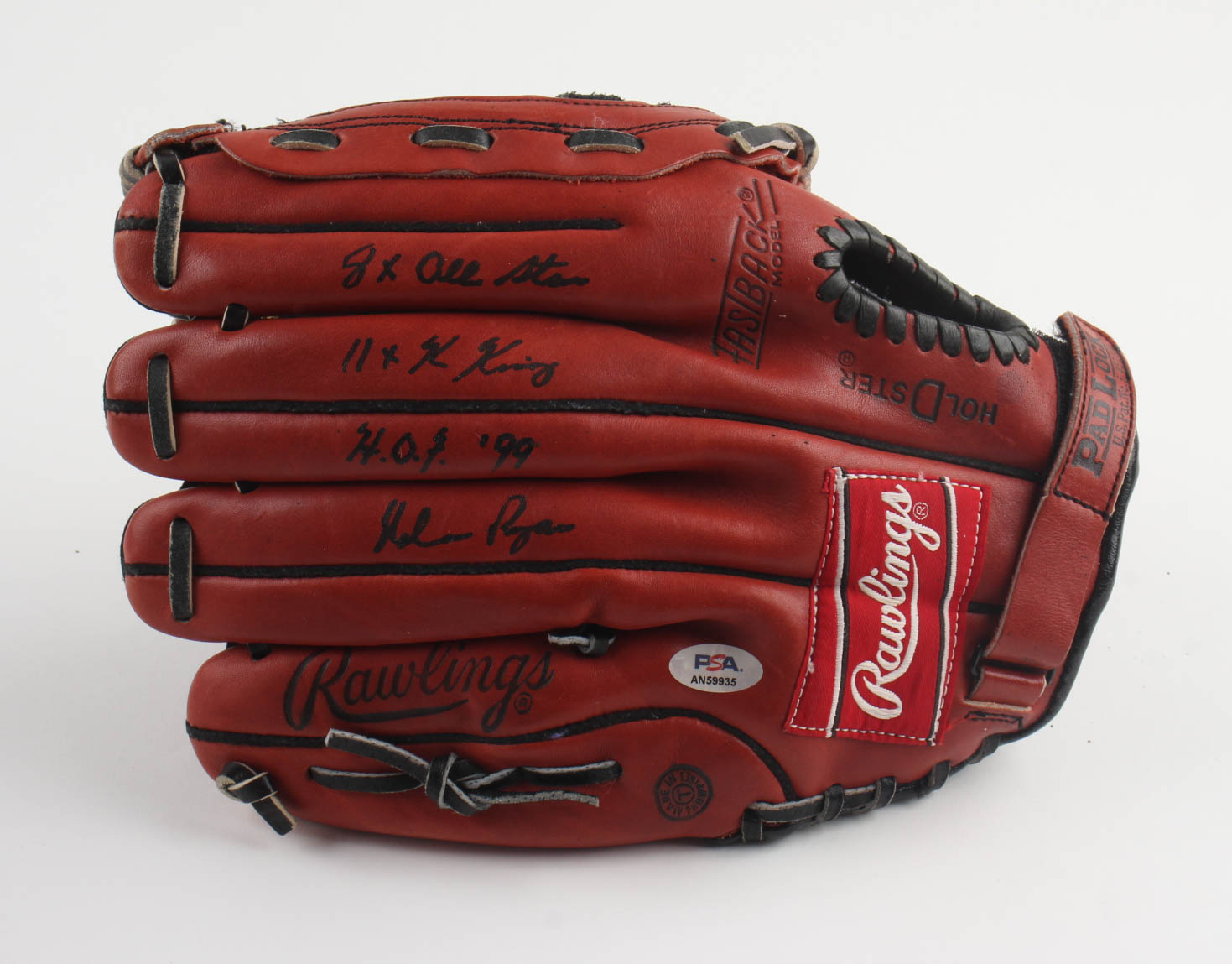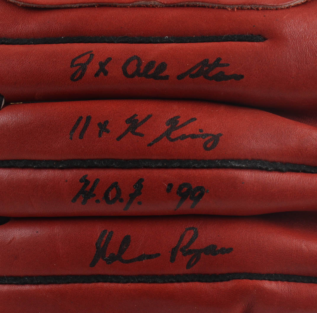 Rawlings baseball glove has been hand-signed and inscribed by Nolan Ryan (Texas Rangers, HOF).