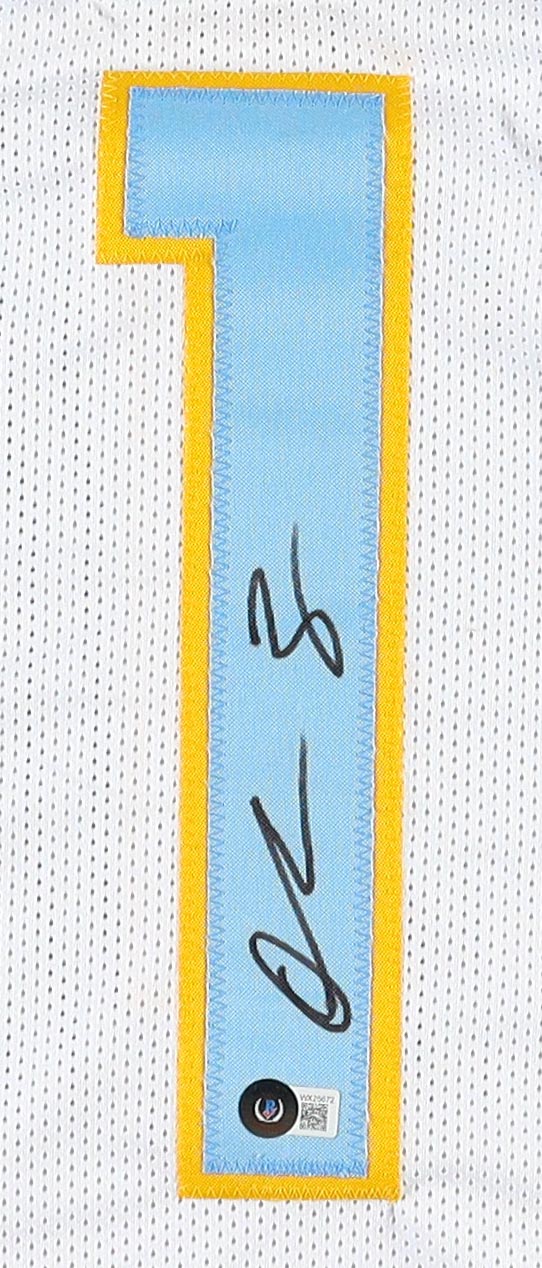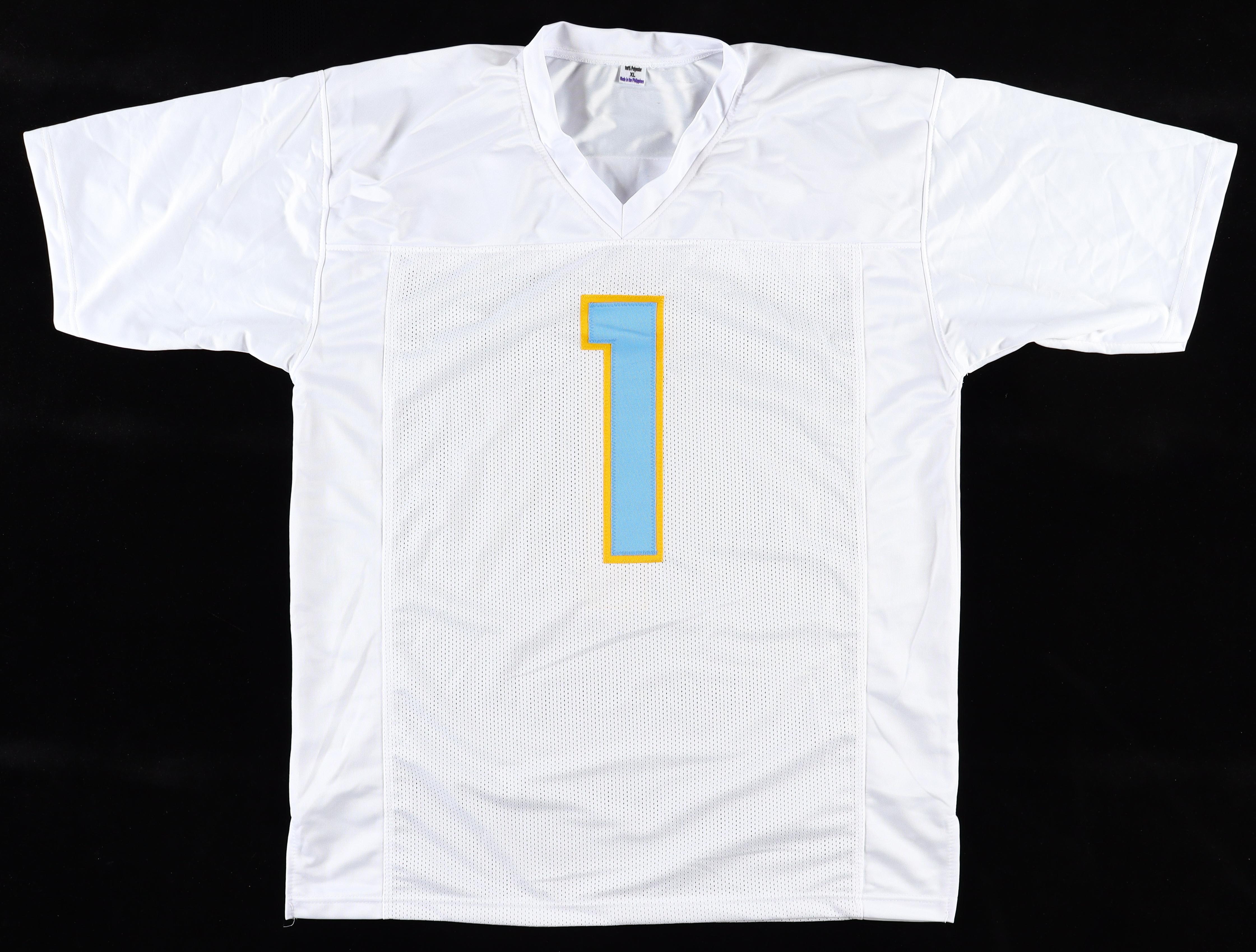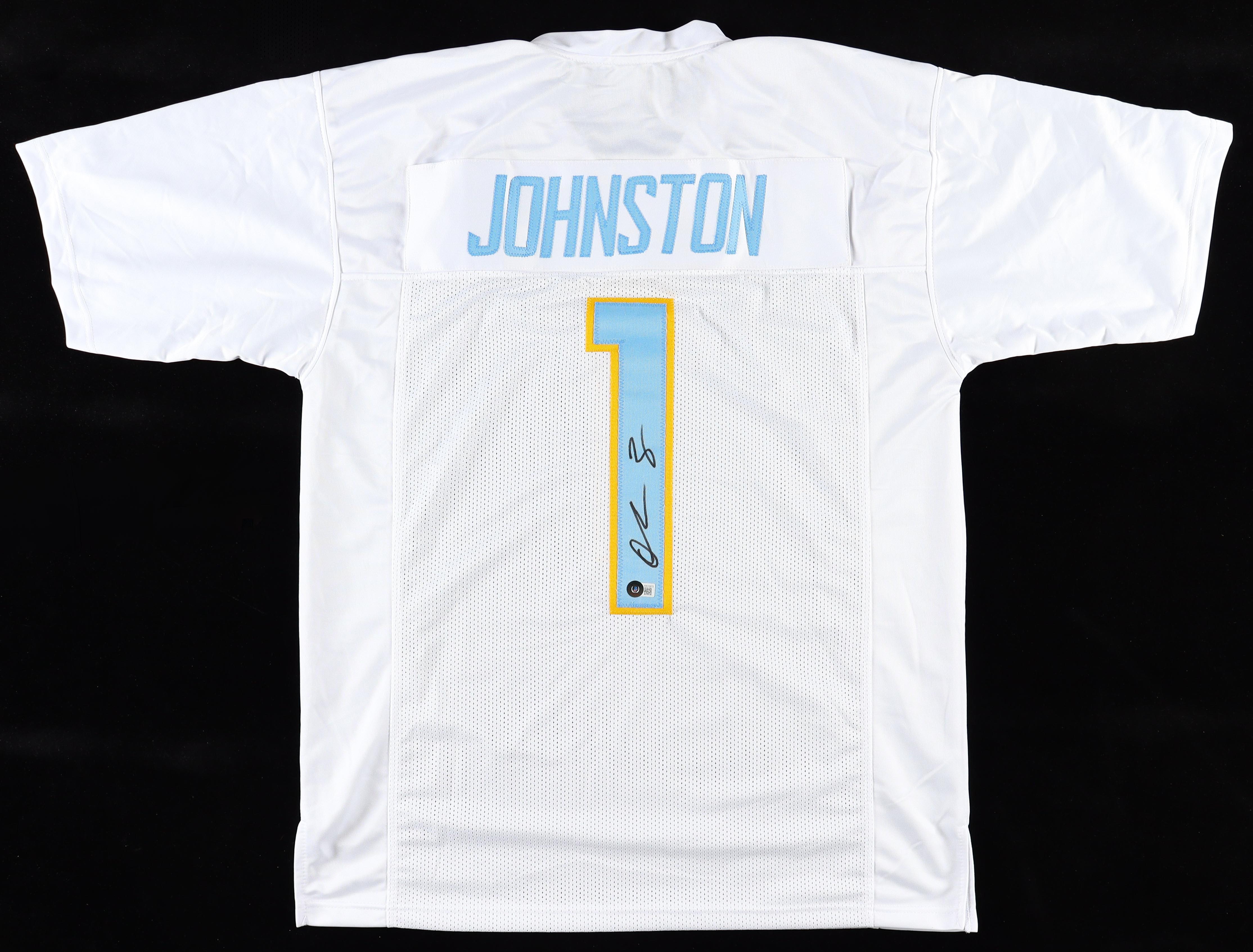Custom jersey. Everything sewn on, size XL. Hand-signed by Quentin Johnston.