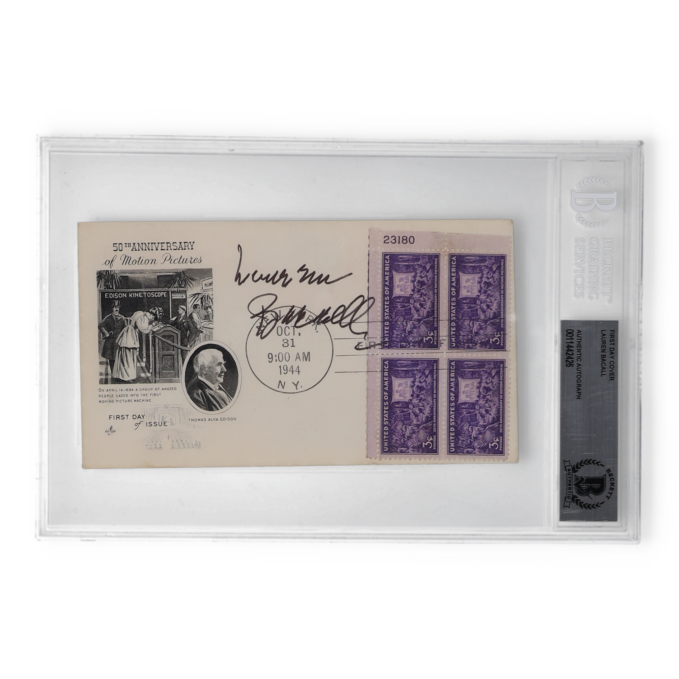 Lauren Bacall Signed "50th Anniversary of Motion Pictures" 1944 FDC Envelope (Beckett)