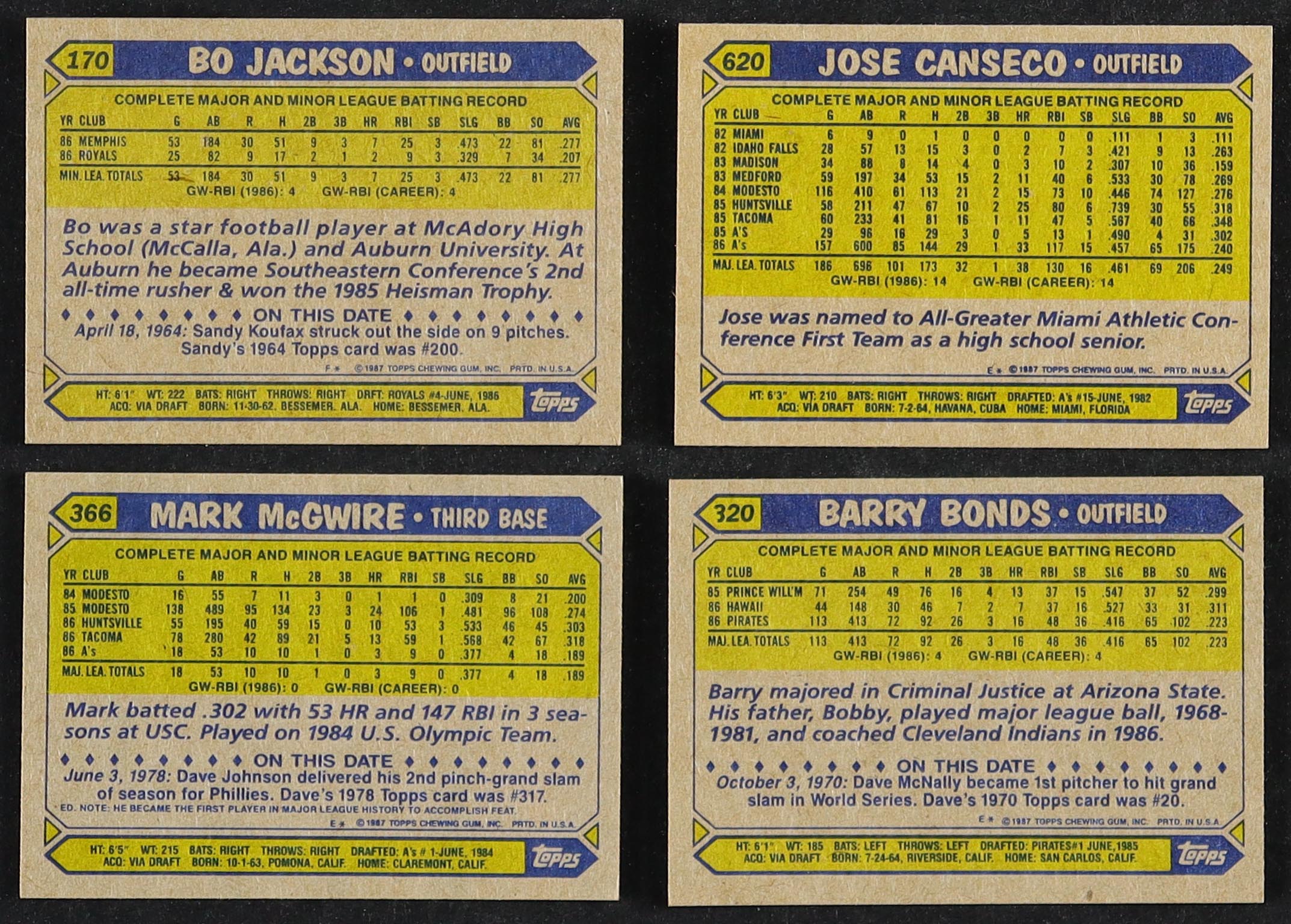 1987 Topps Baseball Complete Set of (792) Cards with Barry Bonds #320 RC, Bo Jackson #170 RC, Mark McGwire #366, Barry Larkin #648 RC