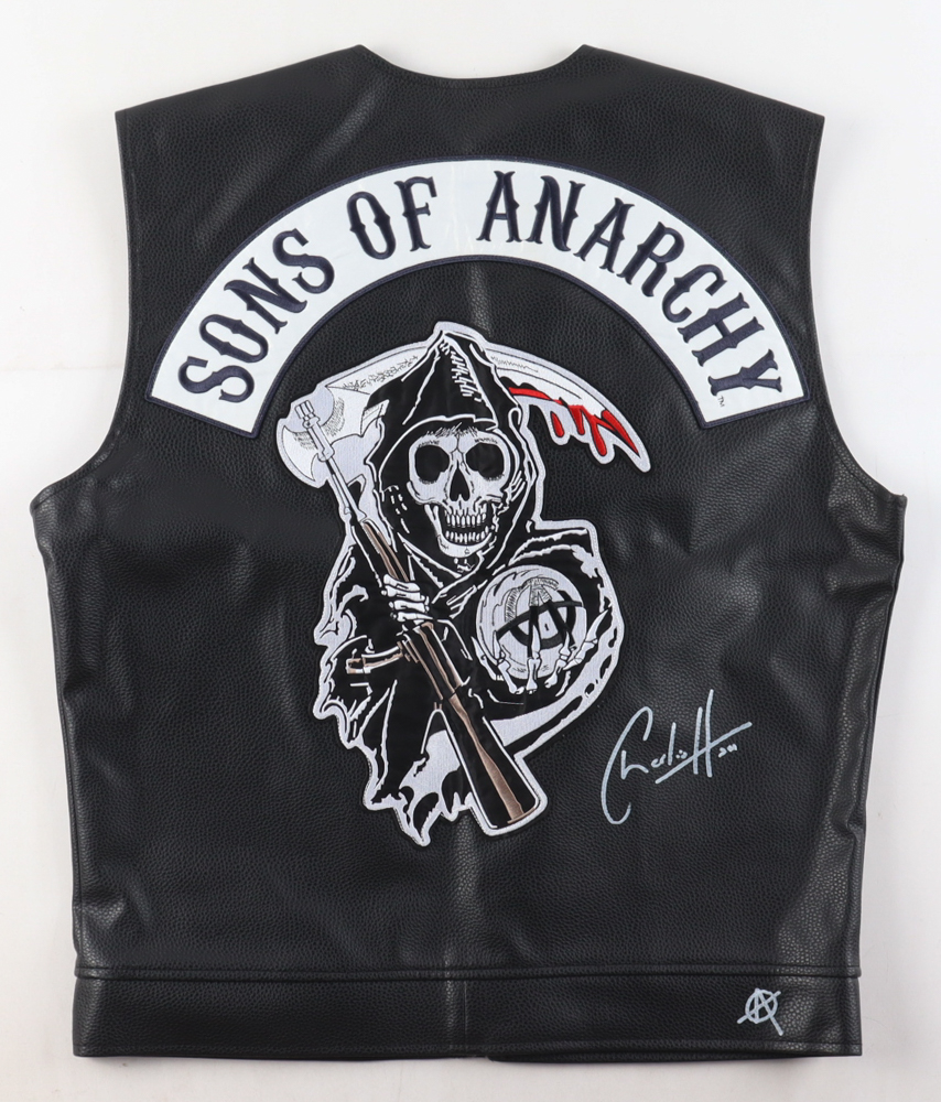 Sons of Anarchy replica vest with everything sewn on. size L. Hand-signed and inscribed by Charlie Hunnam (Jax Teller).