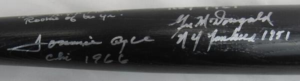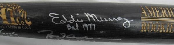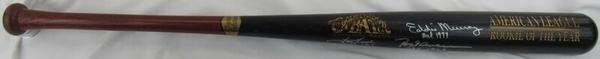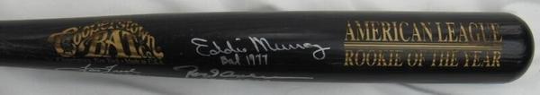 Cooperstown American League Rookie of the Year baseball bat has been hand-signed and inscribed by (5) players. Signers on the bat include Eddie Murray, Rod Carew, Tom Tresh, Tommie Agee and Gil McDougald.