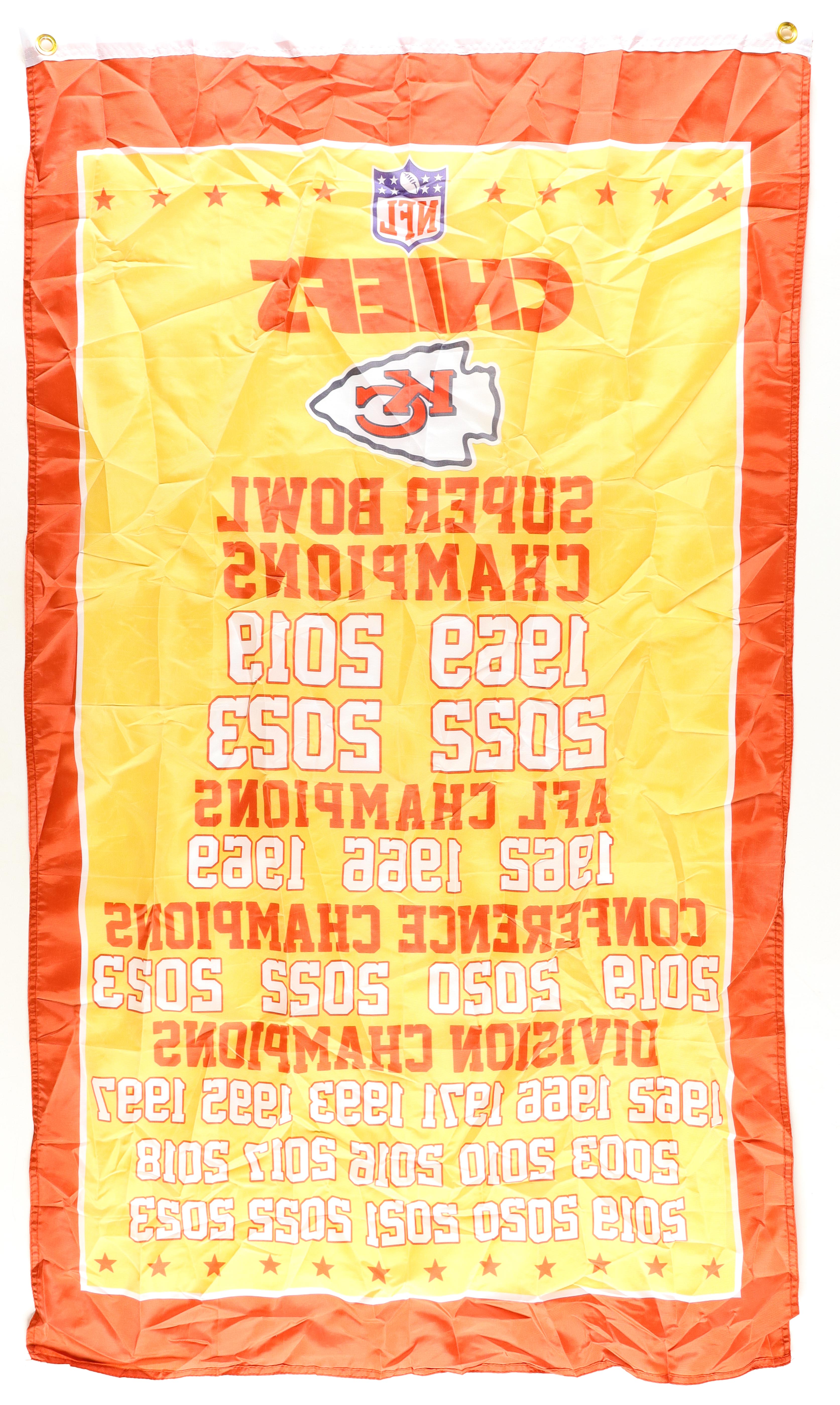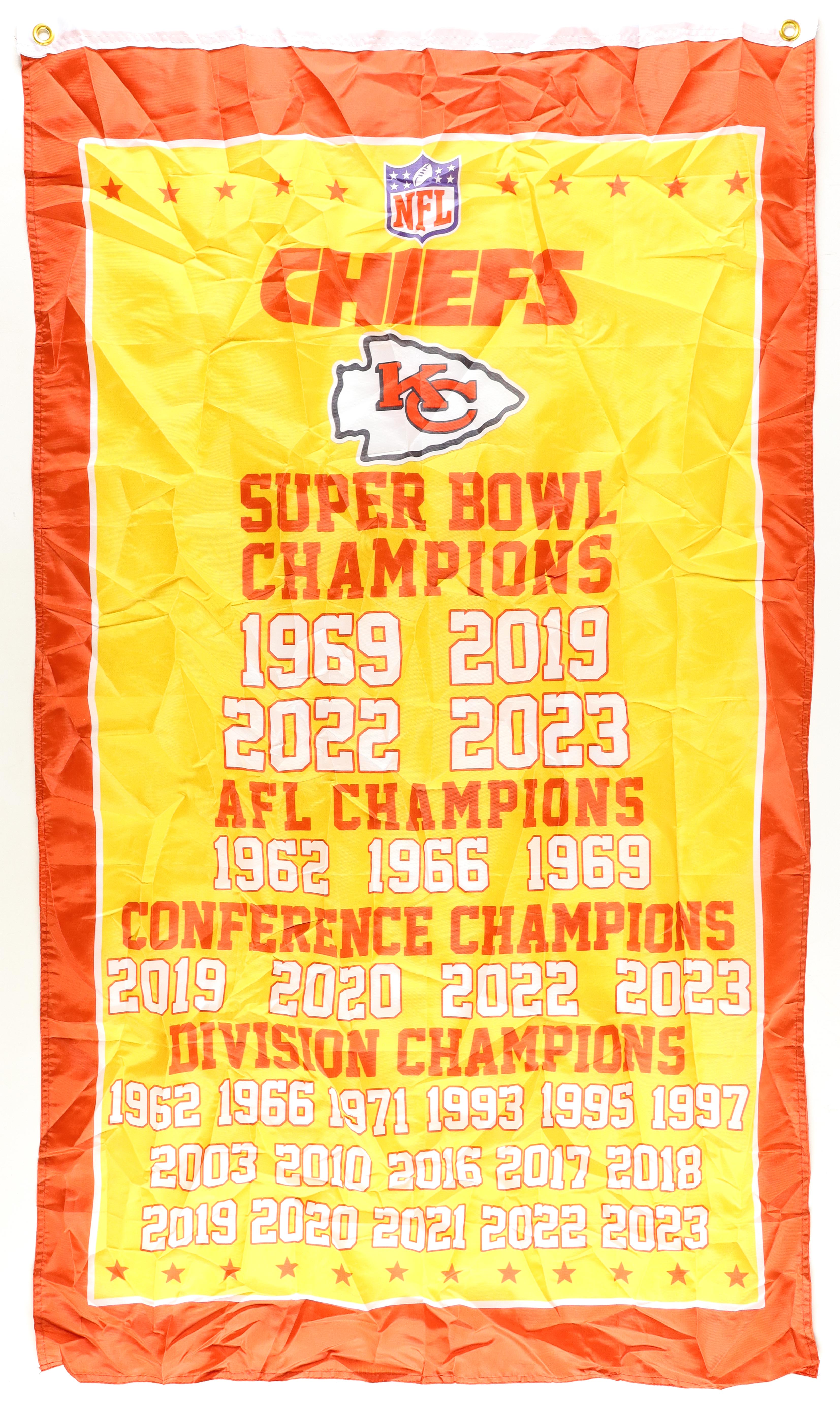 Kansas City Chiefs Super Bowl Champions replica banner measures approximately 33.5" x 58" in size.