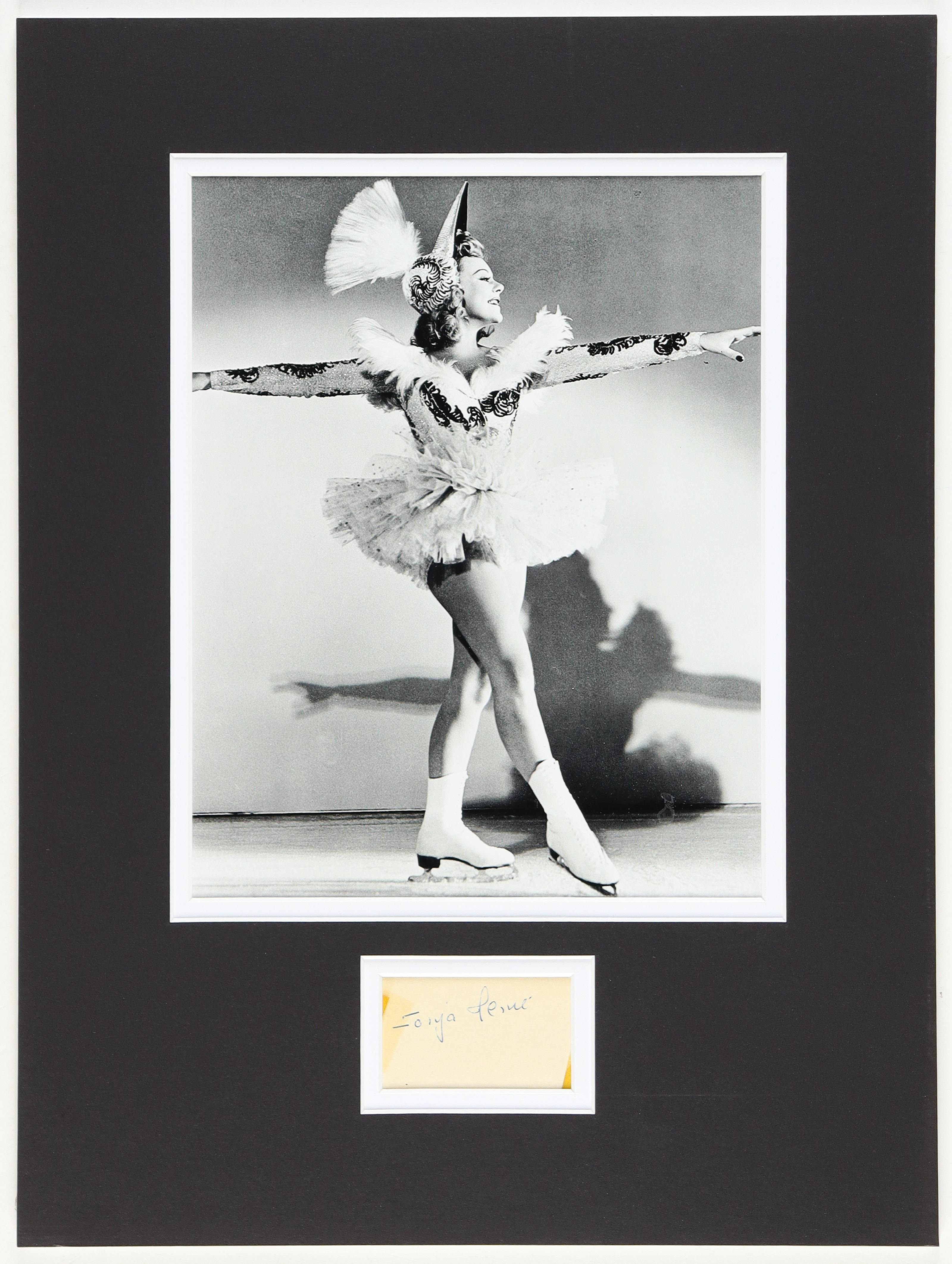 Custom matted display measures 12" x 16" in size and features a cut that has been hand-signed by Sonja Henie (D. 1969). Please note, there is slight corner wear on the matting, staining on the cut and slight corner wear.