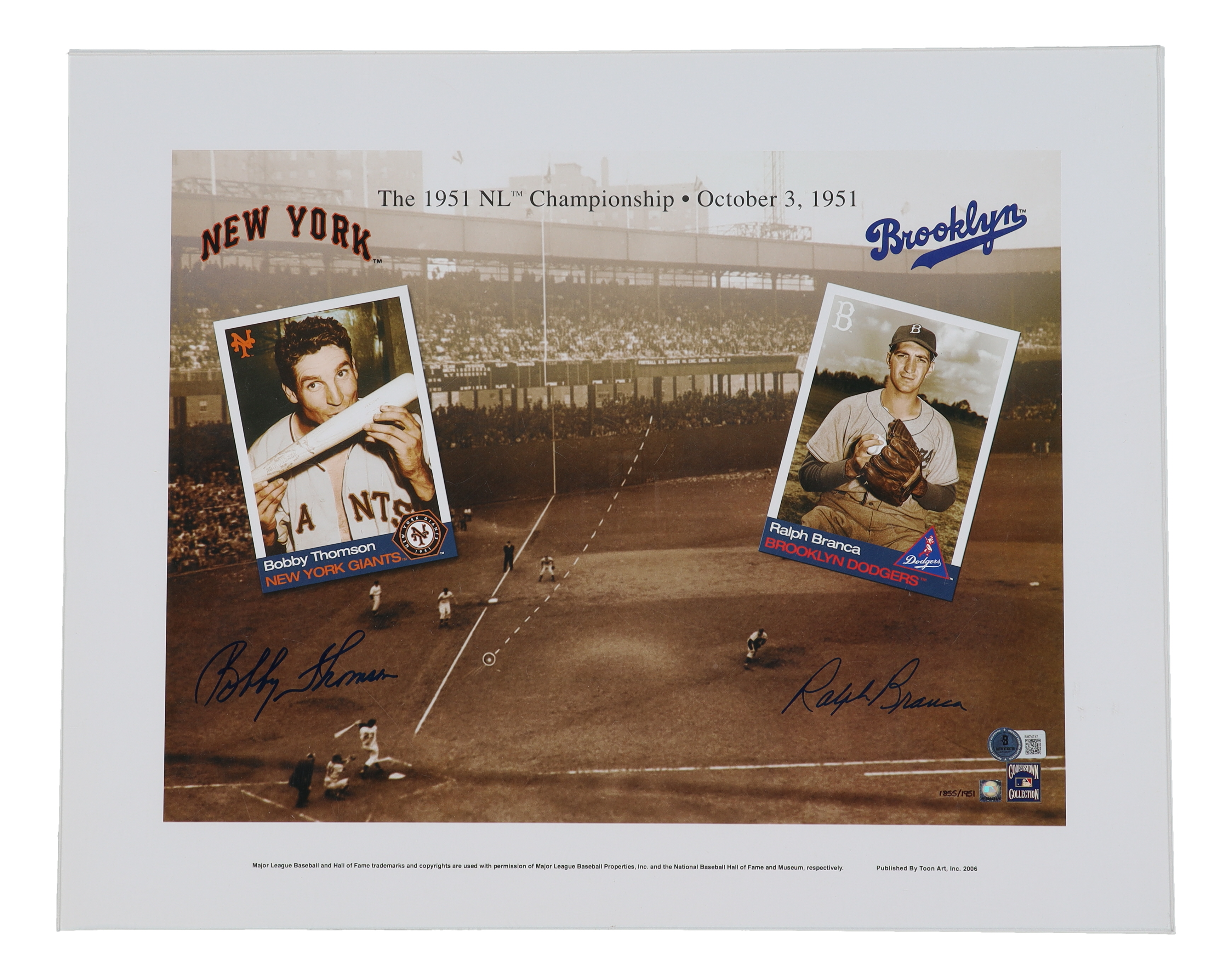 Print measures 16" x 20" in size. Hand-signed by Bobby Thomson (D. 2010, New York Giants) and Ralph Branca (D. 2016, Brooklyn Dodgers).