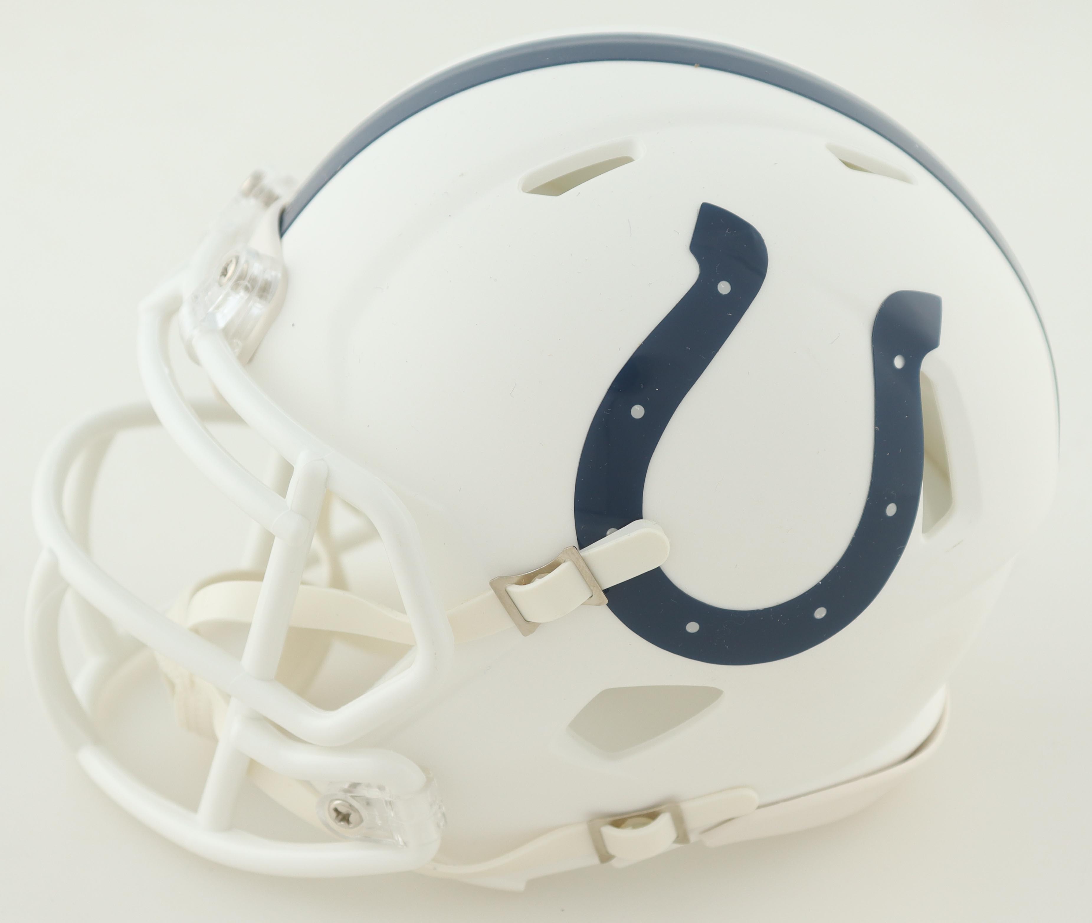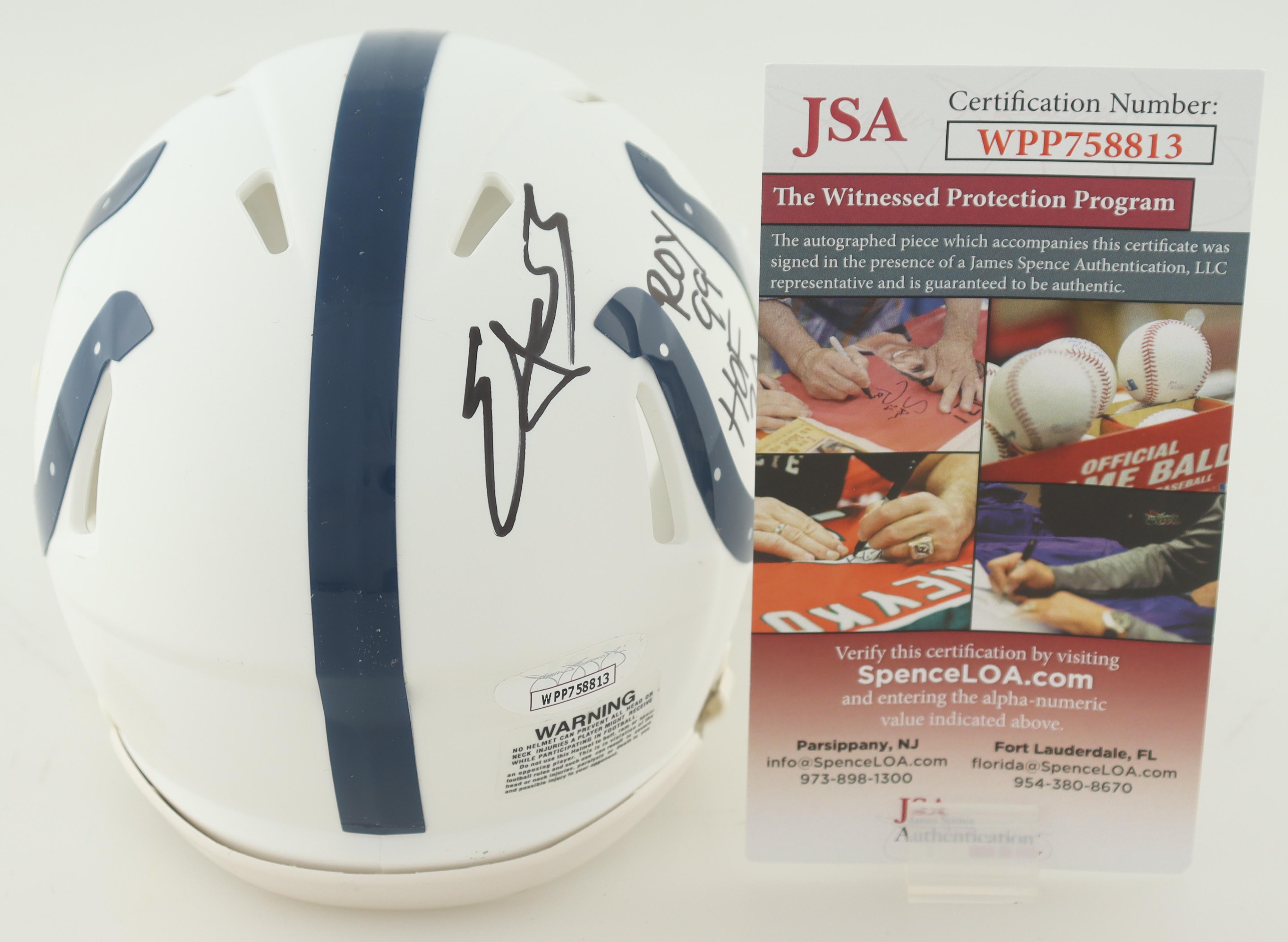 Riddell Indianapolis Colts Speed mini helmet with display case. Hand-signed and inscribed by Edgerrin James (HOF).