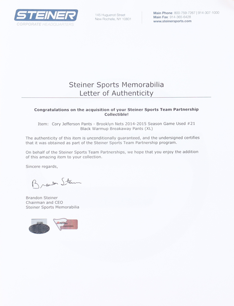 Adidas warm-up set. Everything is sewn on, size XL. This warm-up set was worn by Cory Jefferson (Brooklyn Nets) during the 2014-15 NBA season. Please note, this item has not been signed.