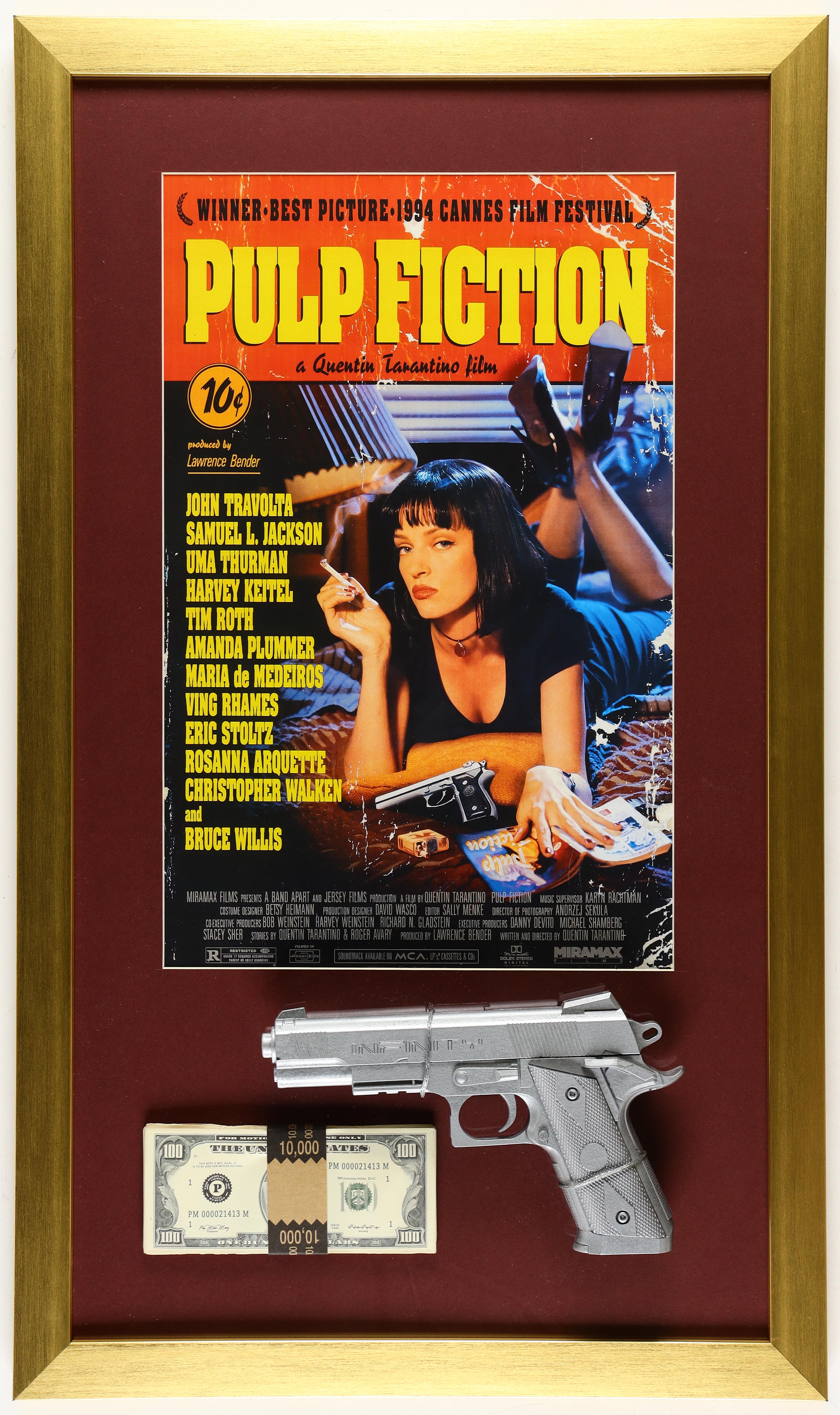Custom frame measures approximately 17.5" x 29.5" in size and features a Pulp Fiction poster as well as a prop money stack and prop pistol. Please note display is unsigned.