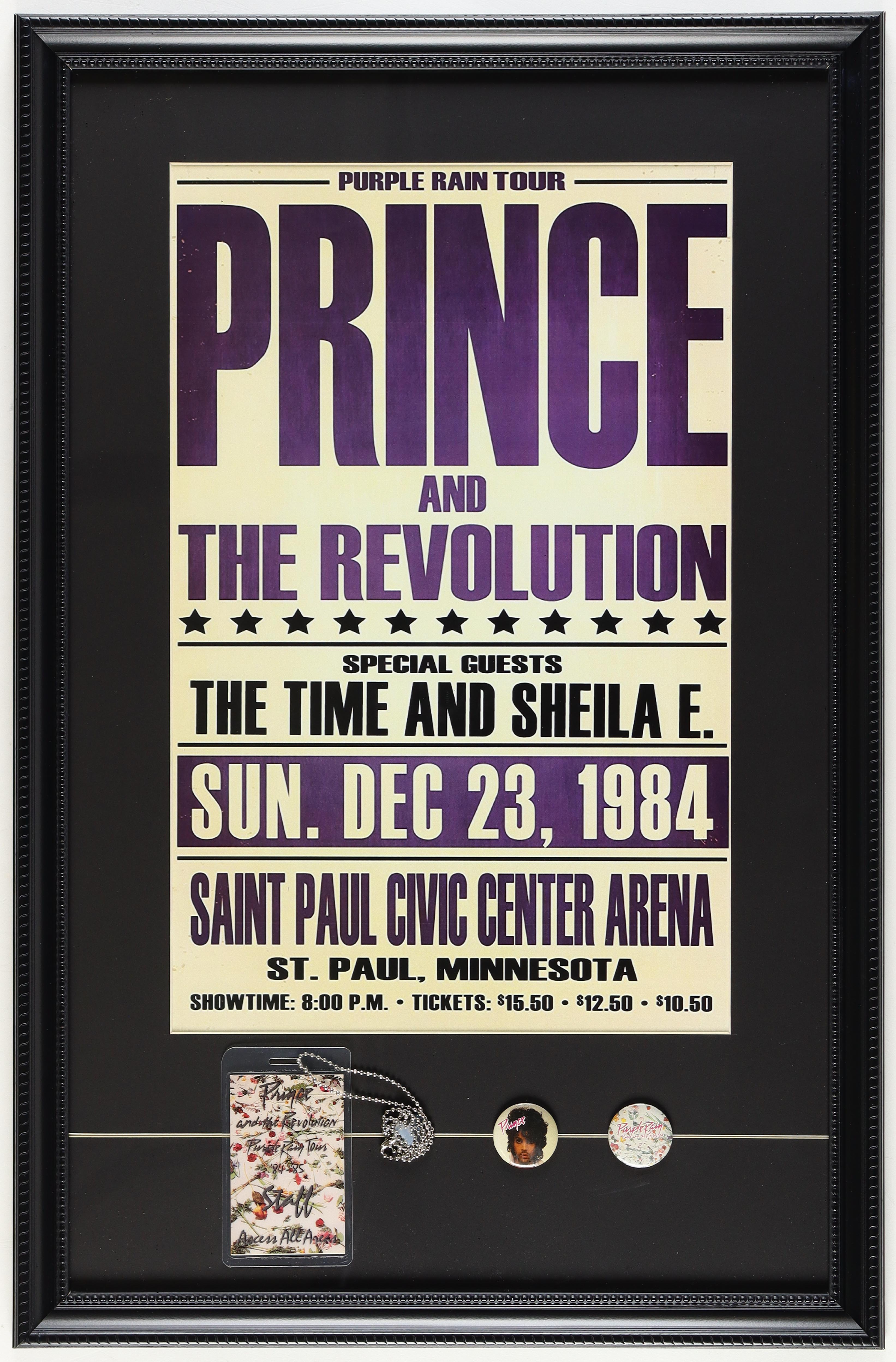 Custom frame measures approximately 17" x 26" in size and features a "Prince and the Revolution Purple Rain Tour" concert poster, original 1984 vintage backstage pass, and (2) concert pins.