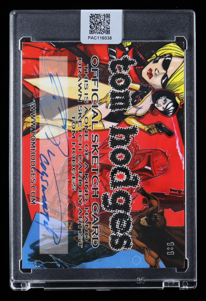 This original sketch card includes original art by renowned comic book artist, Tom Hodges. Also includes a character name inscription on the back by the artist.