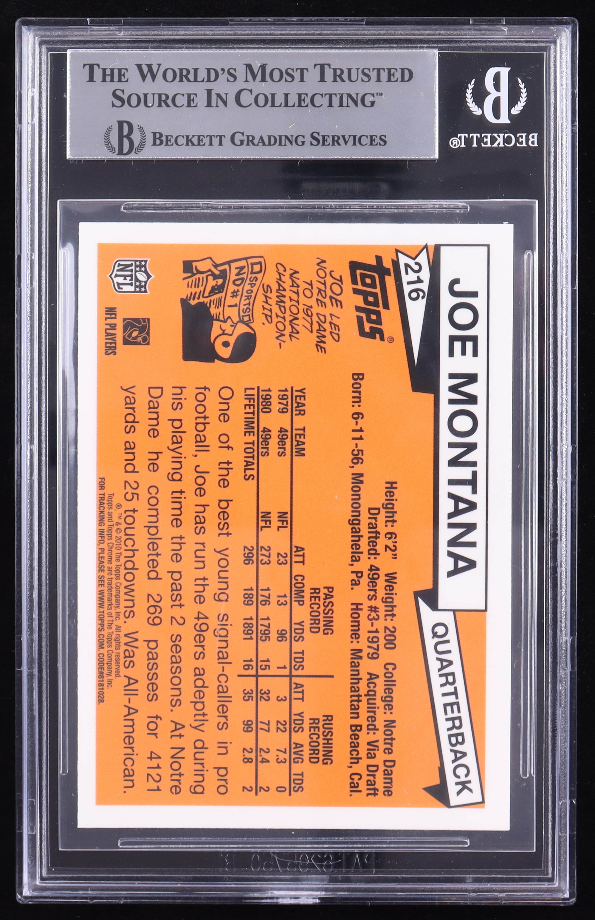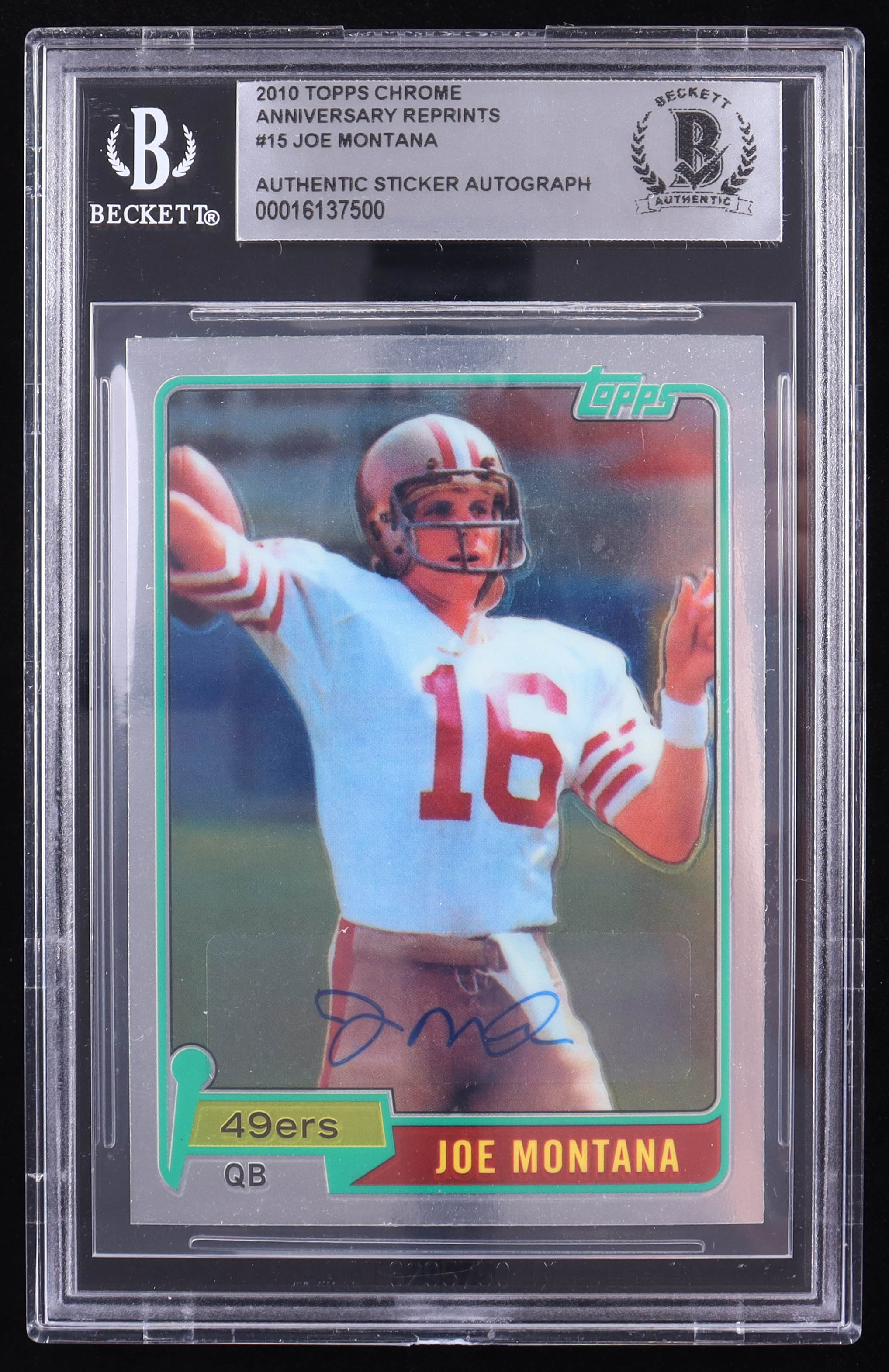Joe Montana Signed Sticker on 2010 Topps Chrome Anniversary Reprints #15 (BGS)