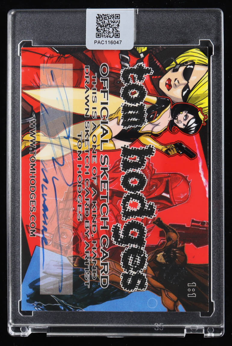 This original sketch card includes original art by renowned comic book artist, Tom Hodges. Also includes a character name inscription on the back by the artist.