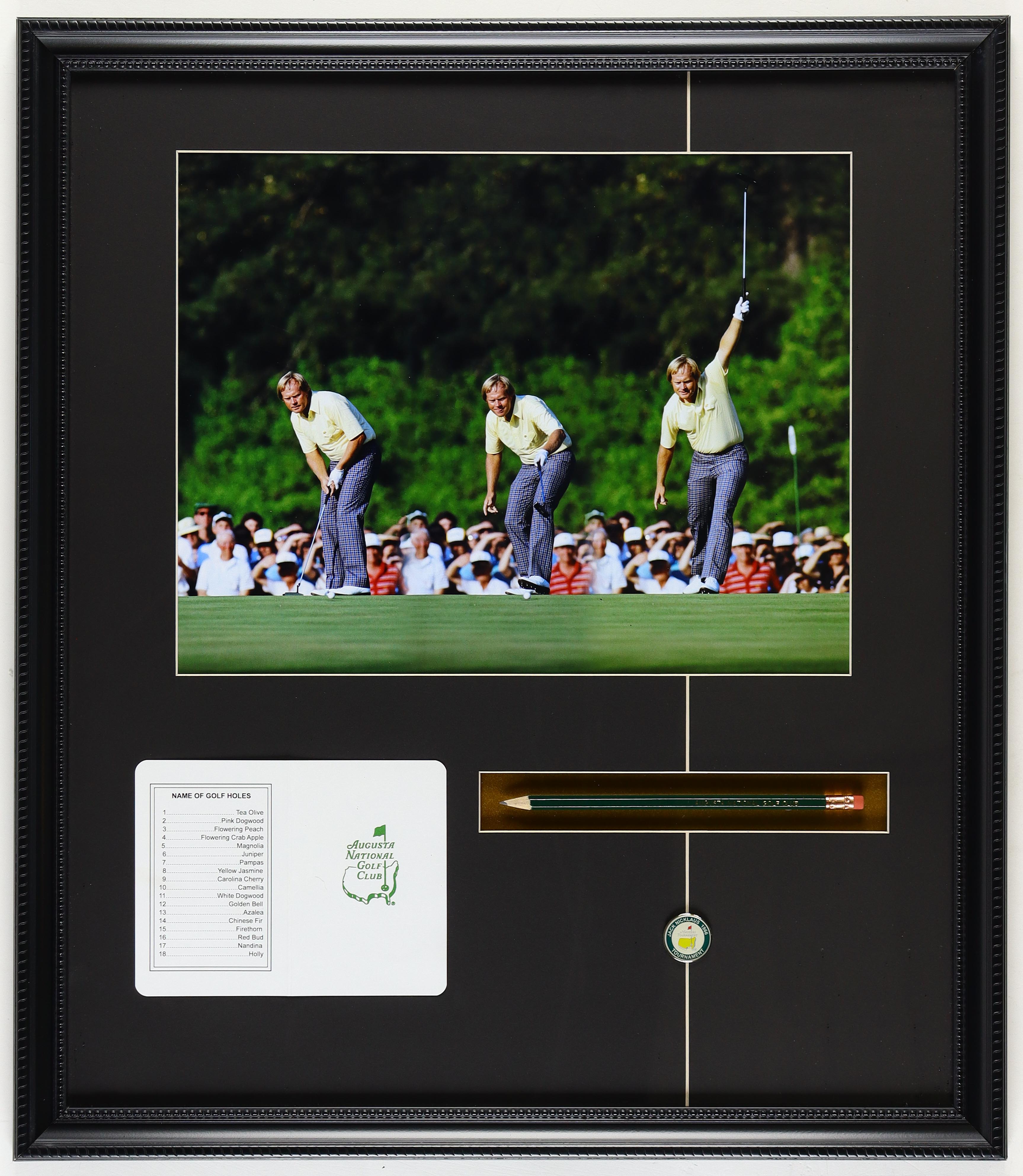 Jack Nicklaus Custom Framed Photo Display With Official 1966 Masters Tournament Pin, Scorecard & Course Pencil