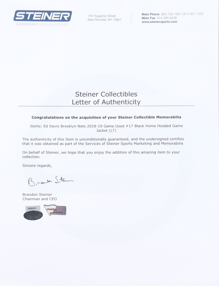 Nike Jacket. Everything is sewn on, size LT. This jacket was worn by Ed Davis (Brooklyn Nets) during the 2018-19 NBA season. Please note, this item has not been signed.