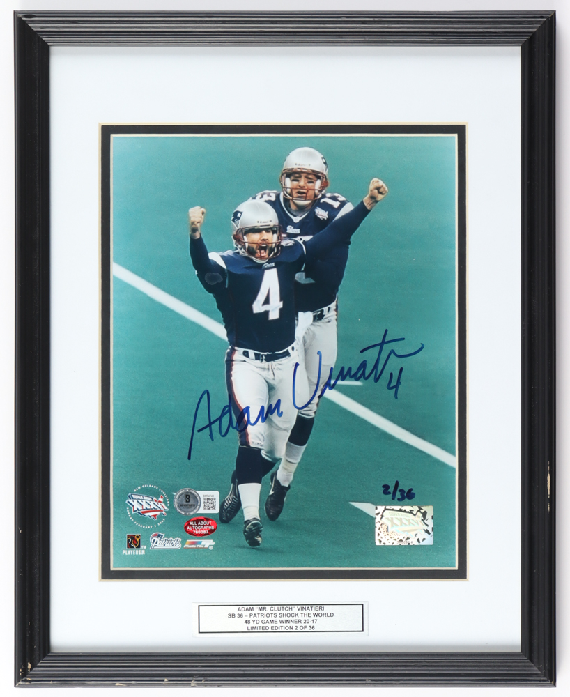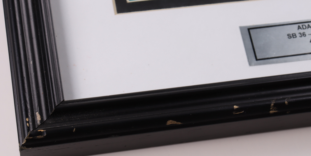 Custom framed display measures approximately 12" x 15" in size and features a photo that has been hand-signed by Adam Vinatieri (New England Patriots). Please note, there are scratches, corner wear and scuffing on the frame.