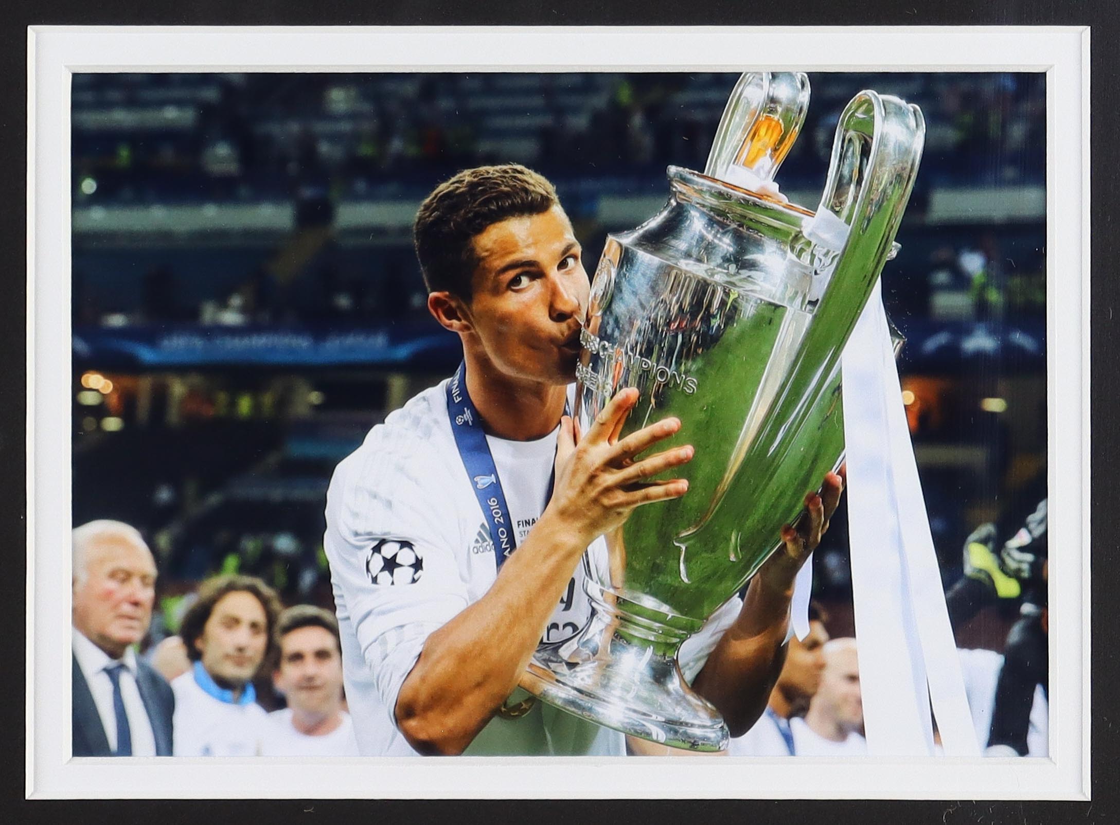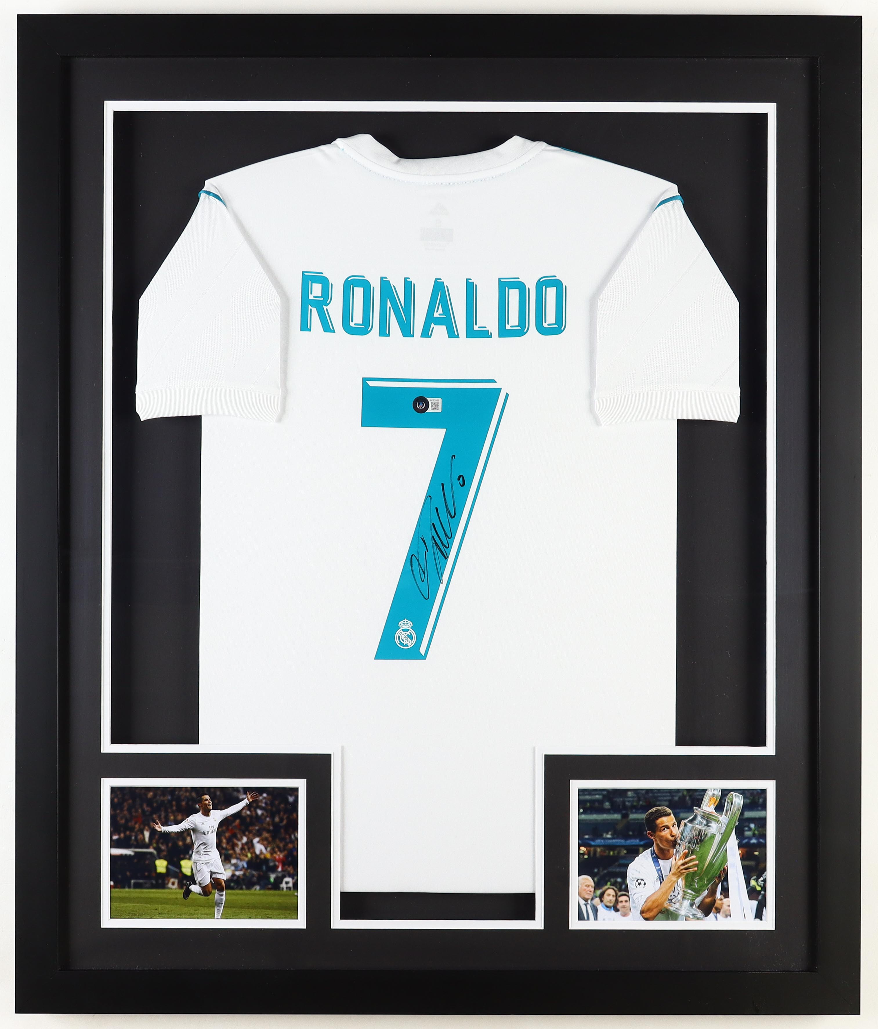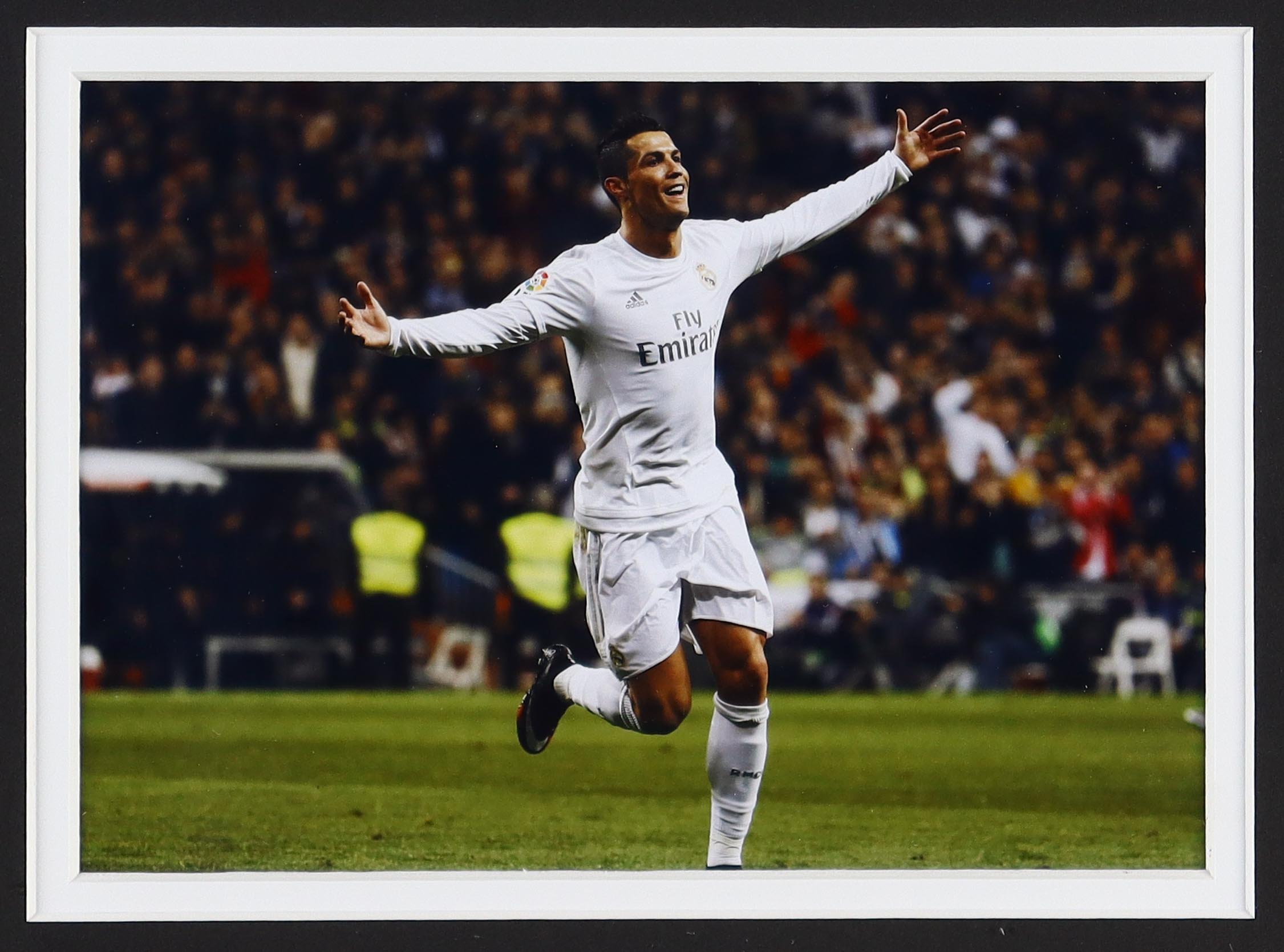 Custom frame measures 30" x 36" in size and features an Adidas jersey that has been hand signed by Cristiano Ronaldo.