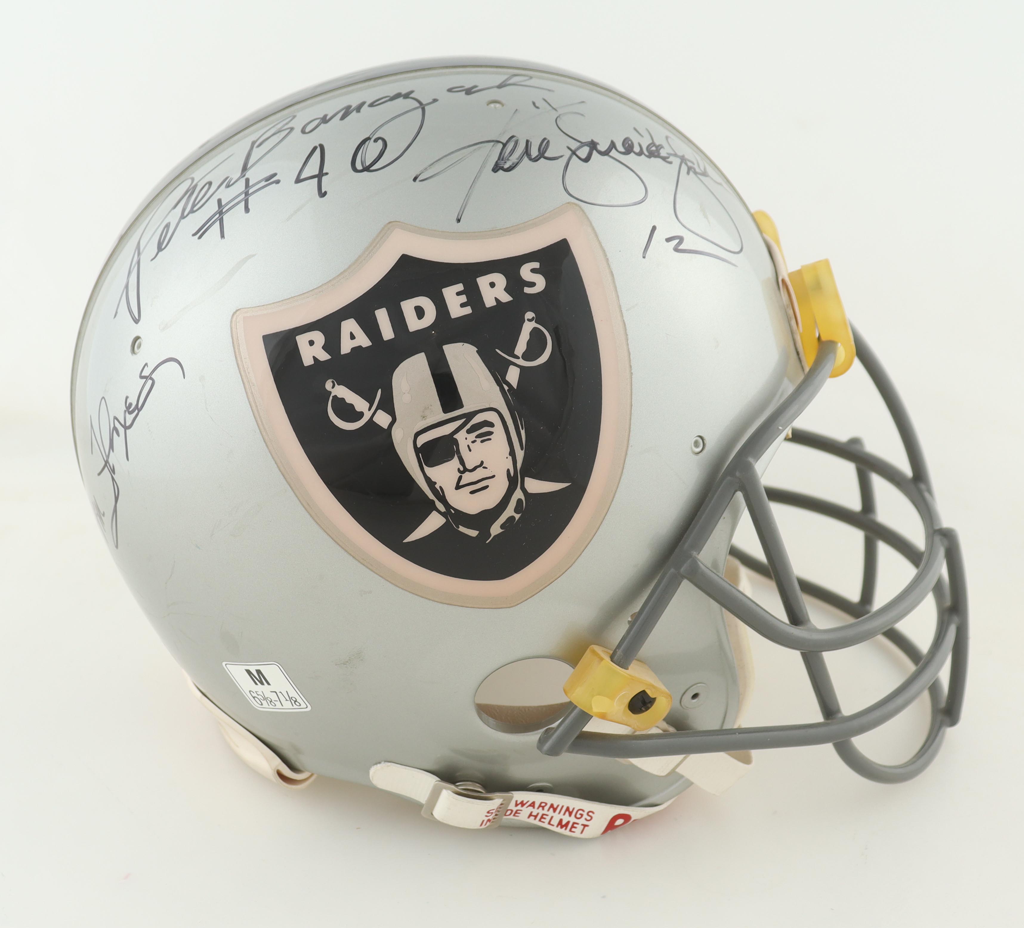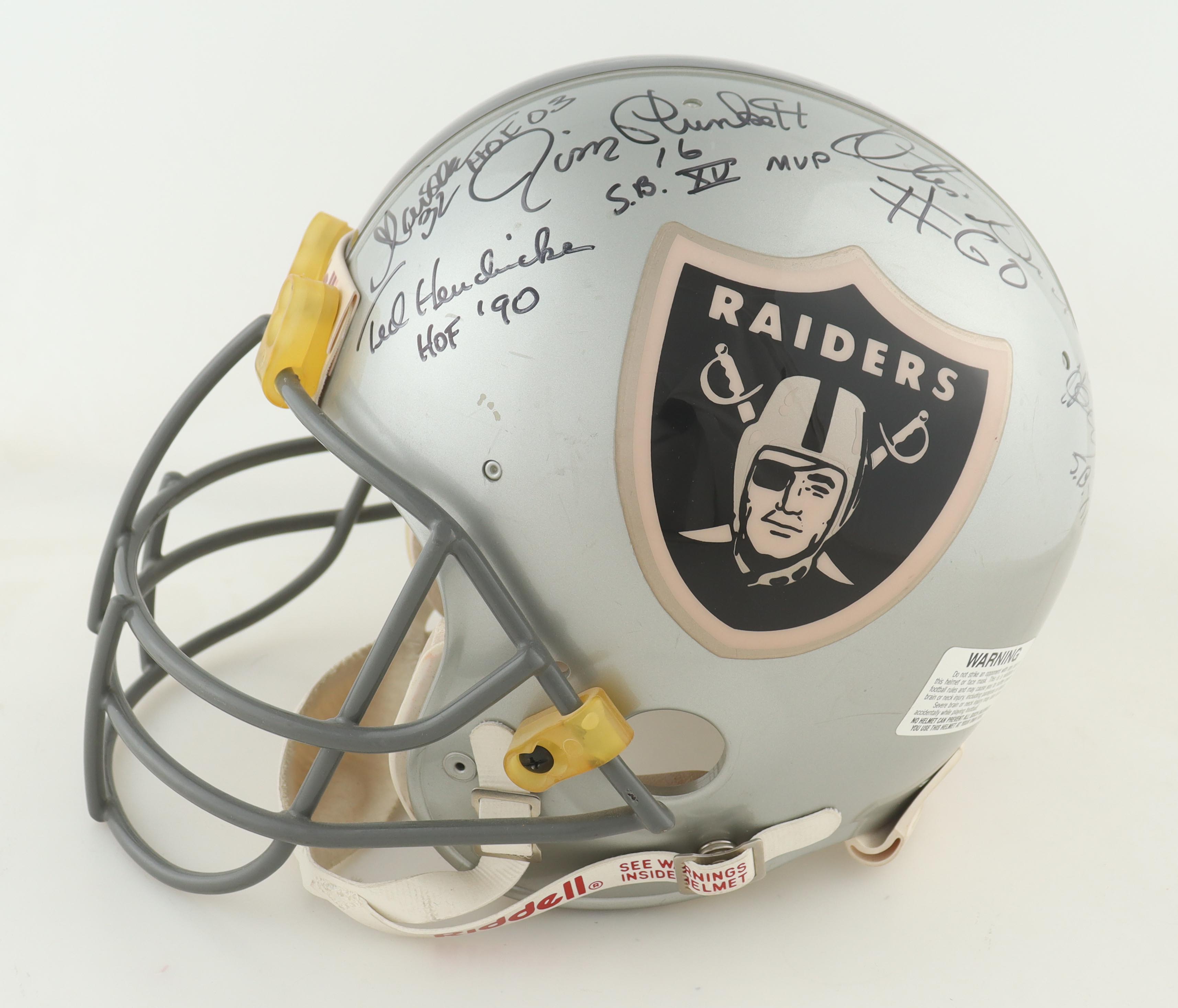 Riddell Los Angeles/Oakland Raiders authentic on-field full size helmet. Hand-signed and inscribed by Marcus Allen, Ken Stabler, Jim Plunkett, Tom Flores, Ted Henricks, Pete Banaszak, Otis Sistrunk, and Henry Lawrence.