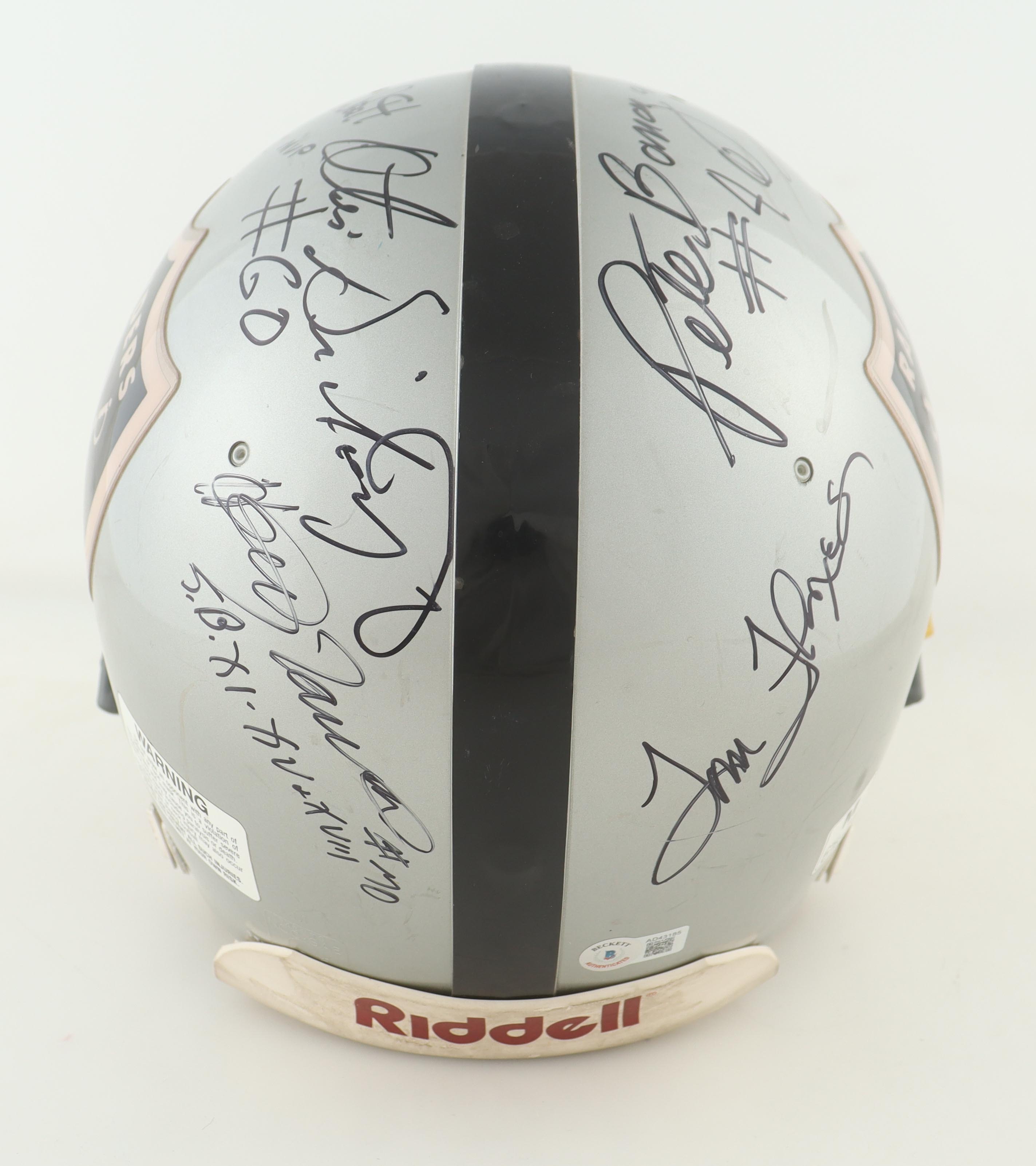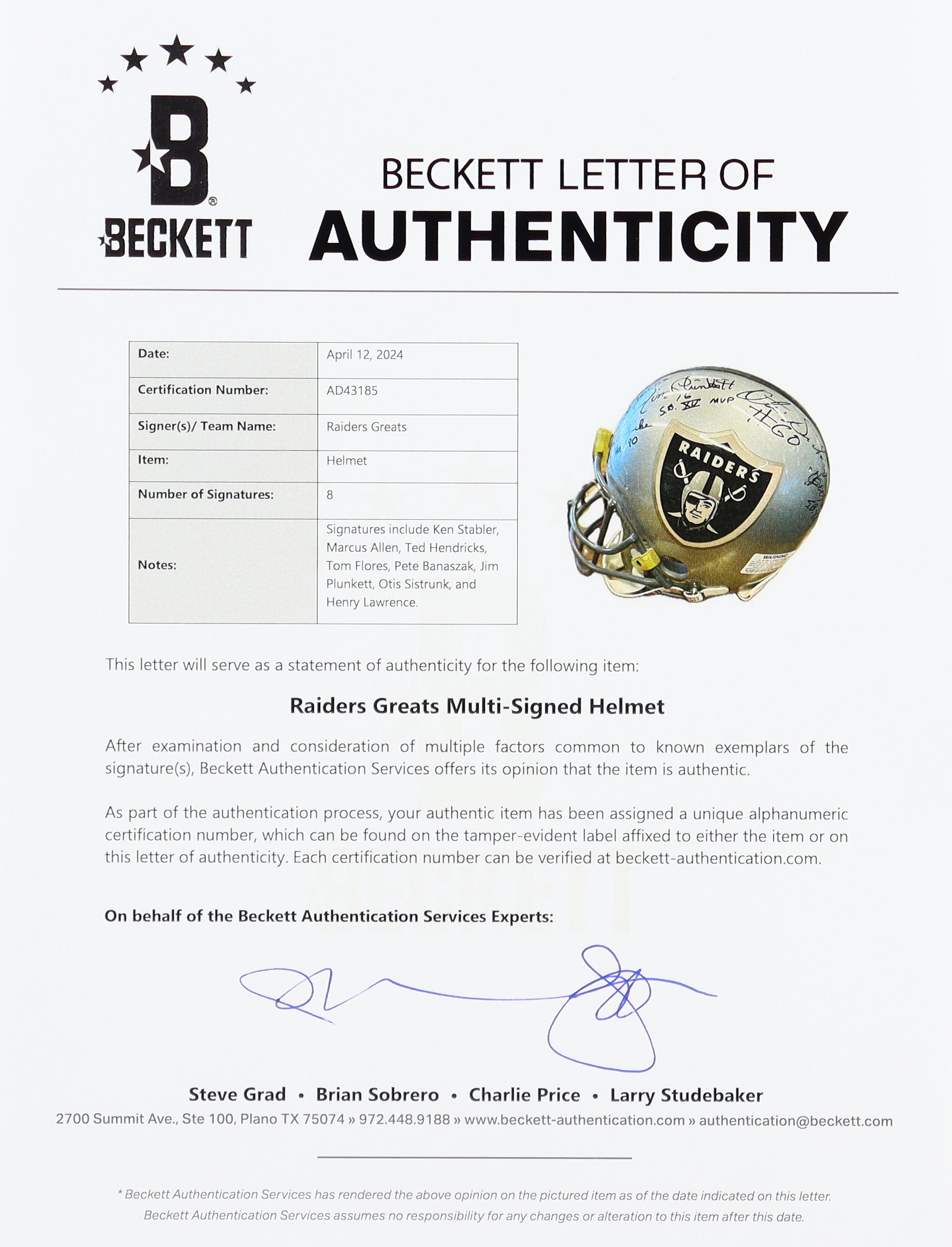 Raiders Legends Multi-Signed & Inscribed Authentic On-Field Full Size Helmet Signed by (8) including Marcus Allen, Ken Stabler, Jim Plunkett, Tom Flores (Beckett)
